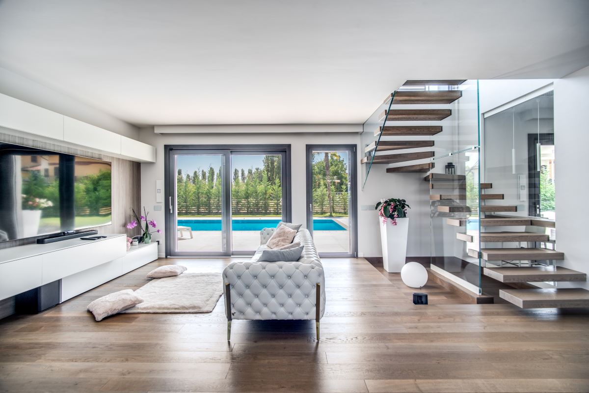 Negli ambienti principali come il living room e le camere è stato utilizzato lo scorrevole Hst di Oknoplast, pensato proprio per abbattere completamente le barriere architettoniche e creare un effetto panoramico, di reale continuità tra gli spazi.