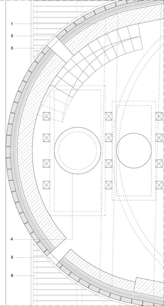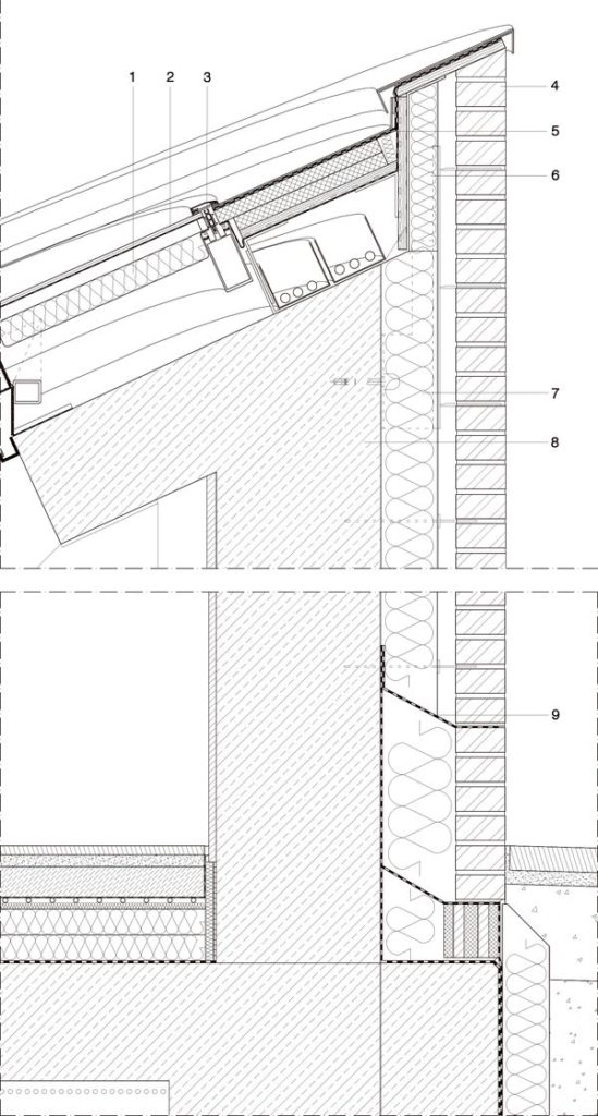 Sezione verticale in corrispondenza della vetrata della copertura e del piede dell’edificio, nella parte inferiore dell’onda.