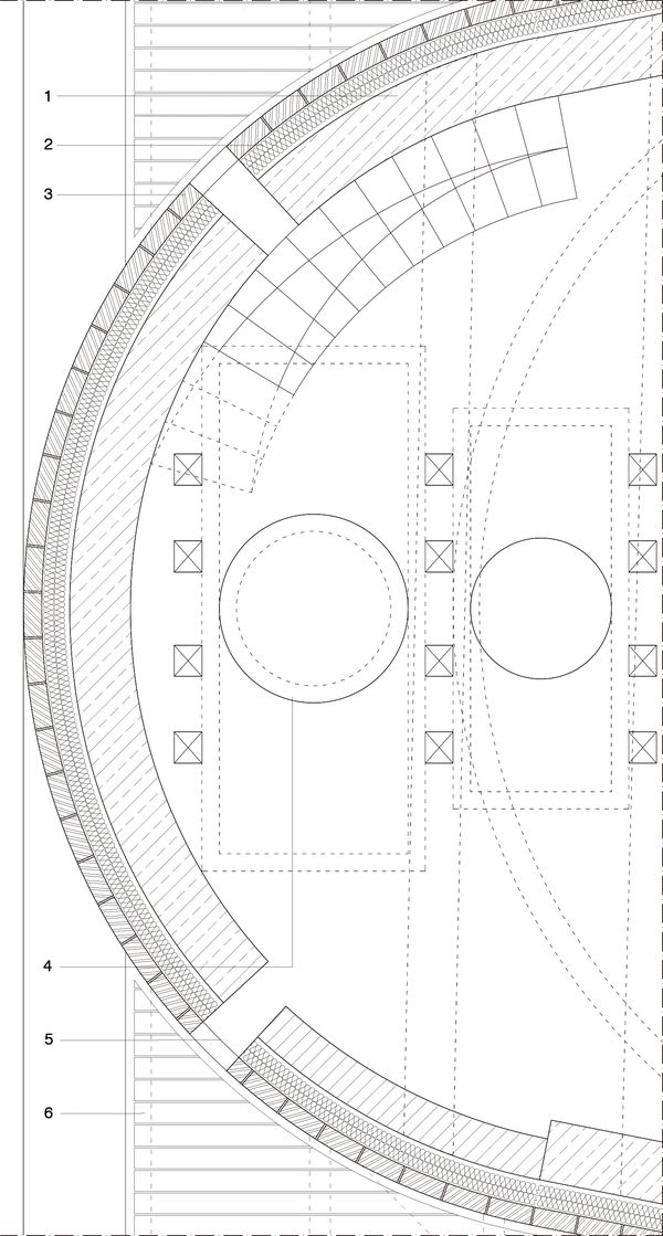 Sezione verticale in corrispondenza della vetrata della copertura e del piede dell’edificio, nella parte inferiore dell’onda.