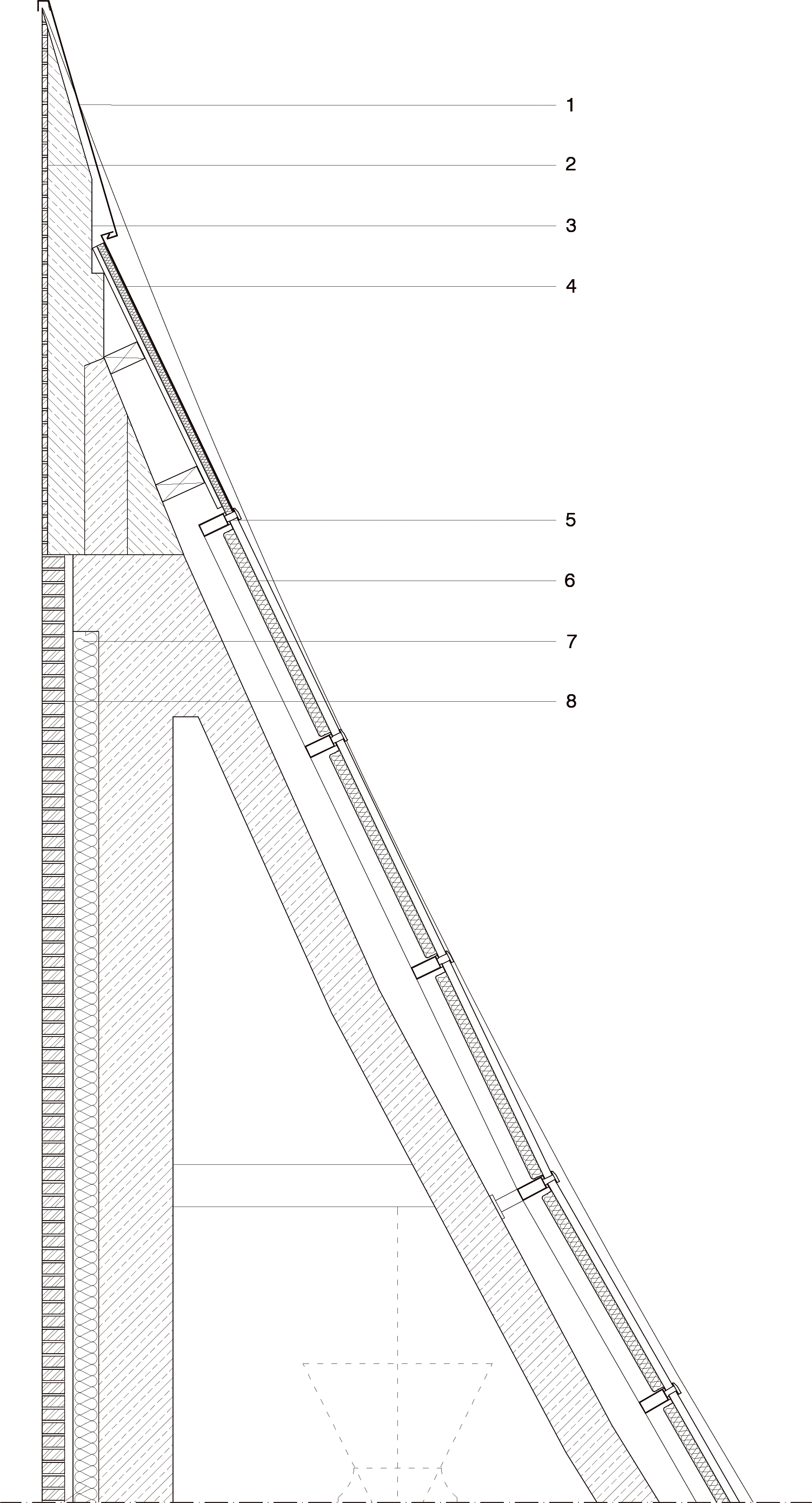 Sezione verticale in corrispondenza della vetrata della copertura, nella parte superiore dell’onda.