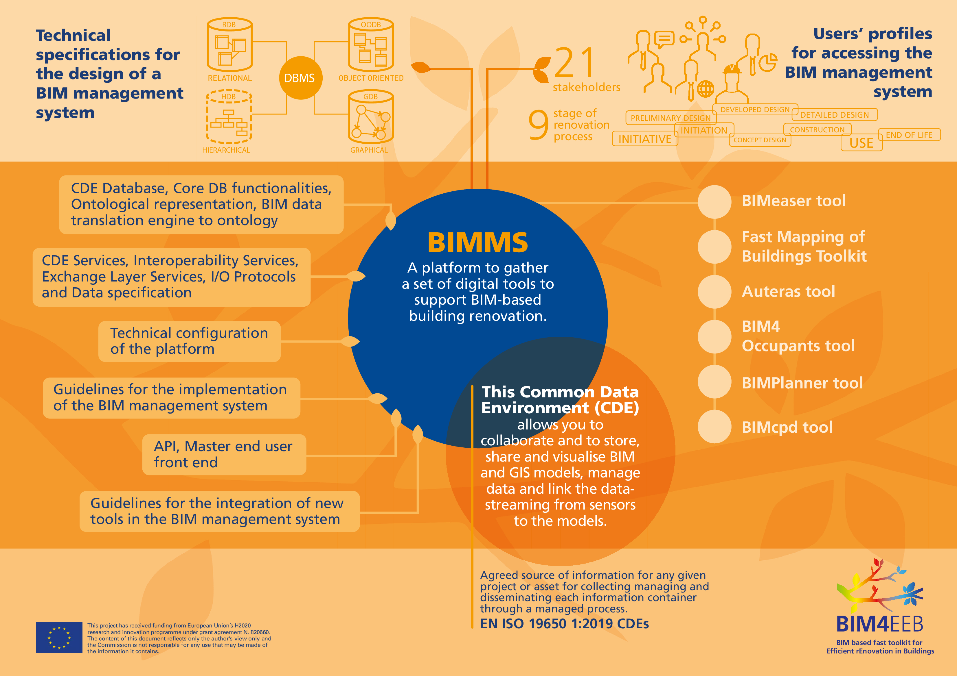 Il sistema di gestione Bim, Bim4eeb Bimms, sarà composto da sei tool, ognuno dedicato a una operazione specifica: Bim4eeb Fast Mapping of Buildings, Bimeaser, Bimcpd, Auteras, Bimplanner, Bim4occupants.