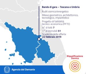 Il bando di gara di Toscana e Umbria fa parte di un più ampio piano di riduzione del rischio sismico per il quale la Legge di Bilancio 2017 ha destinato 950 milioni di euro per i prossimi 10 anni. Già pubblicati i bandi di gara che coinvolgono immobili in Calabria, Friuli Venezia Giulia, Marche, Veneto, Liguria, Abruzzo, Molise e Campania.