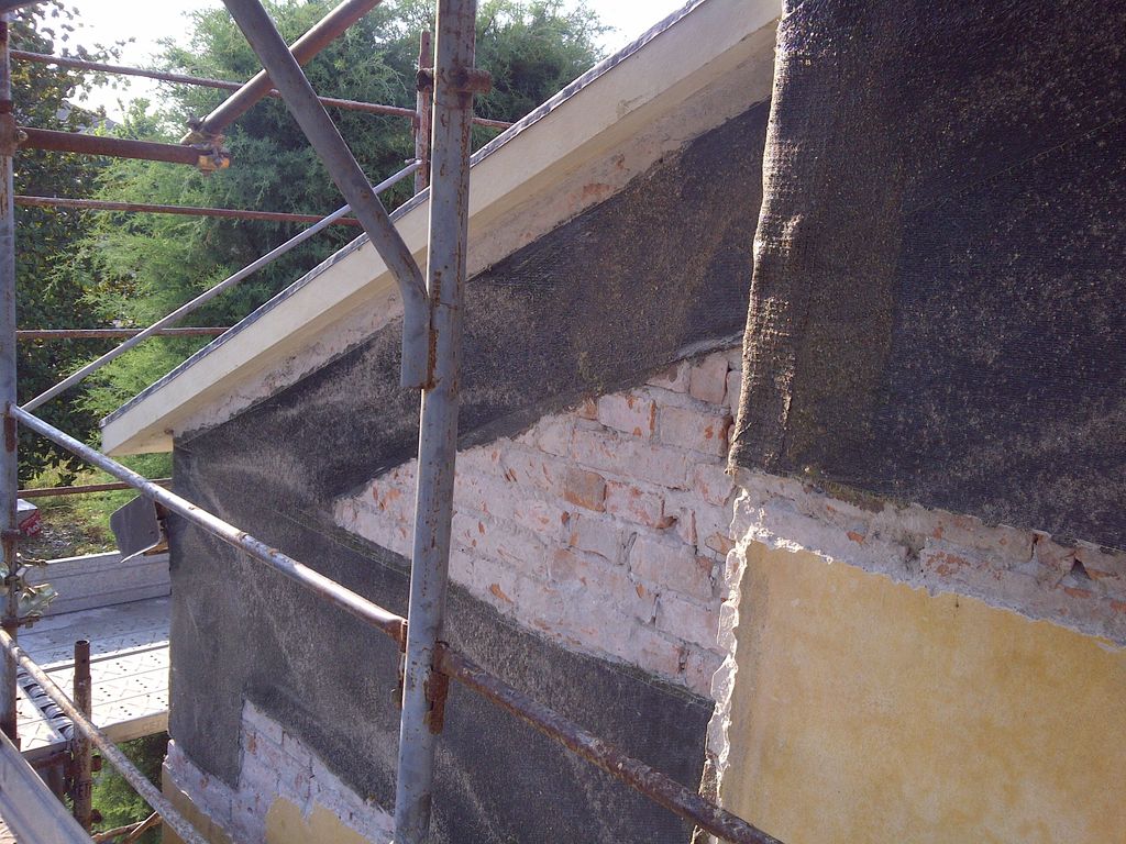 Al fine di migliorare l’ammorsamento tra le pareti è stata realizzata la cerchiatura completa dell’edificio in sommità delle facciate esterne e il rinforzo del timpano in mancanza di cordoli in c.a. con sistema Frp monodirezionale, prevedendo opportune smussature degli spigoli per evitare la concentrazione delle tensioni e connessione con fiocchi in corrispondenza delle lesene. Inoltre in corrispondenza delle fessure è stato applicato il tessuto bidirezionale disposto a cavallo delle fessure.Moglia-20130828-00502