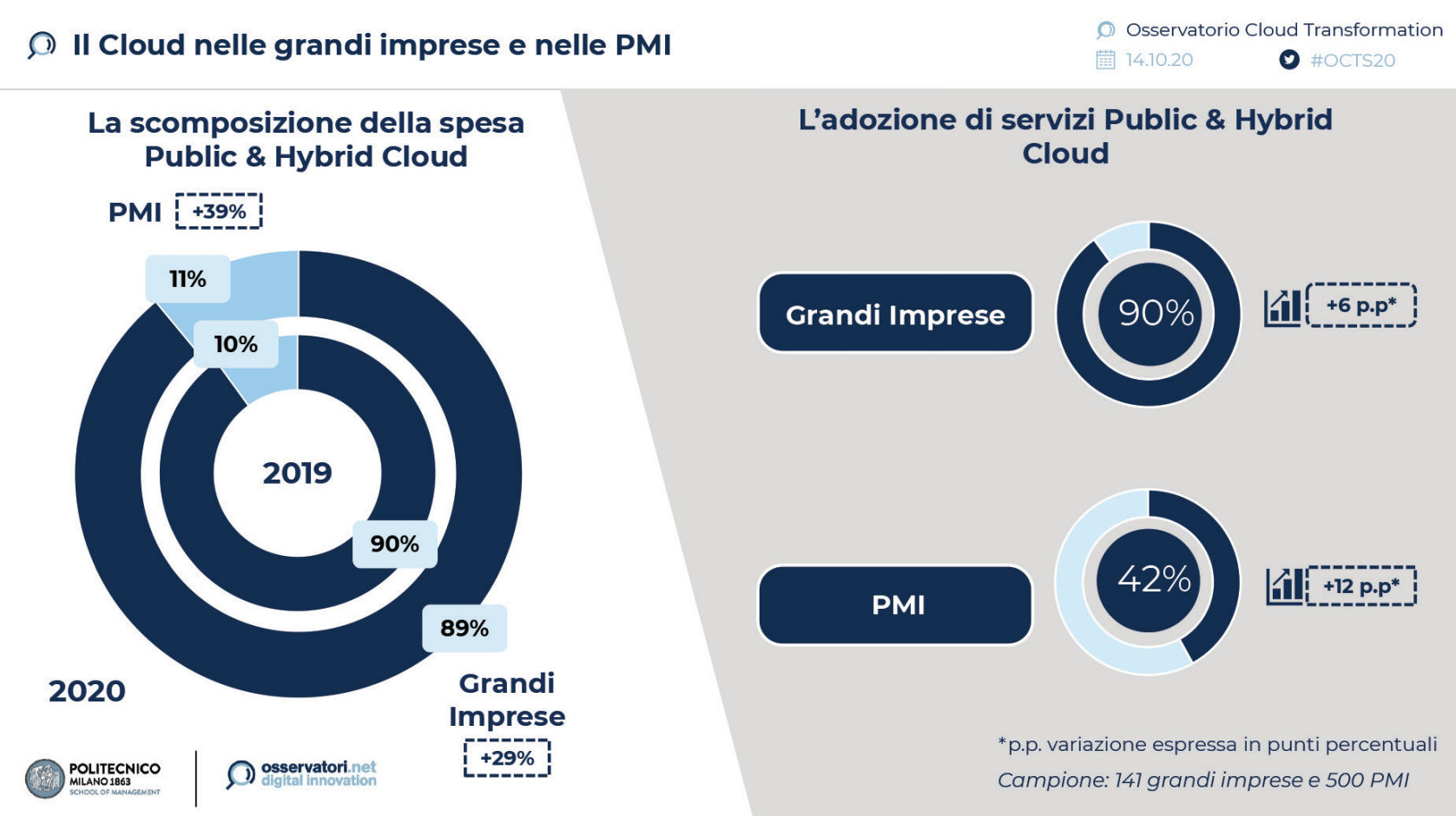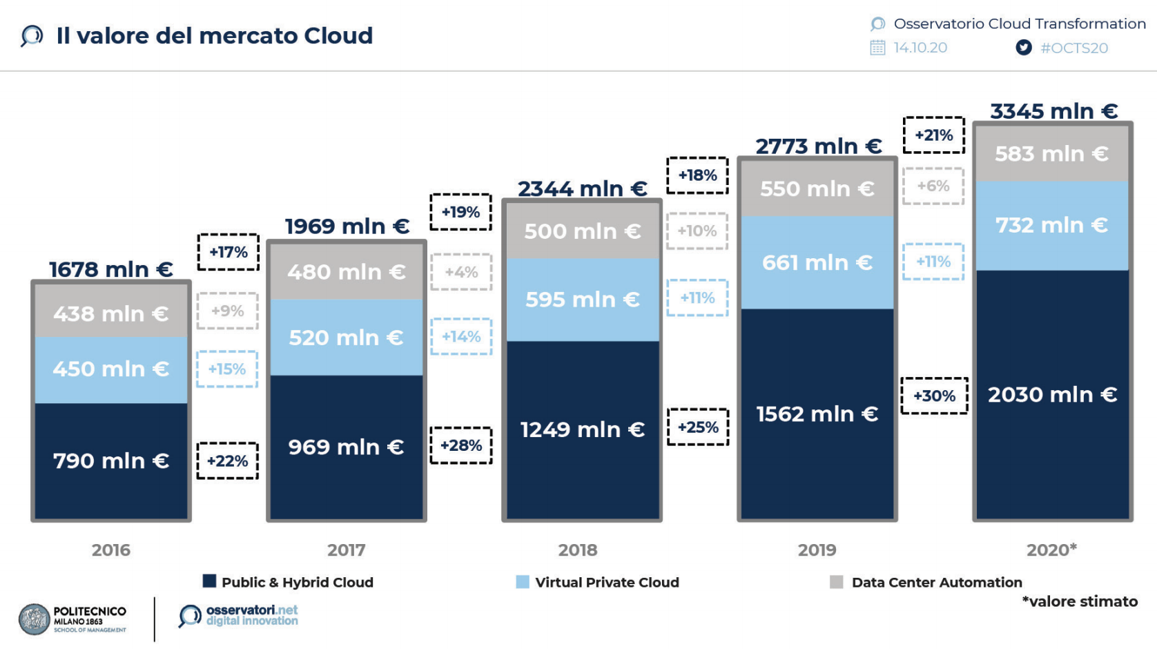 Secondo i dati elaborati dall’Osservatorio Cloud Transformation, promosso dalla School of Management del Politecnico di Milano, il Cloud nel 2020 si è rivelato il miglior alleato per rispondere efficacemente alla catastrofica situazione economica e sociale dovuta alla pandemia. Il mercato del Cloud italiano raggiungerà una crescita del 21%, superando i 3,34 miliardi di euro.