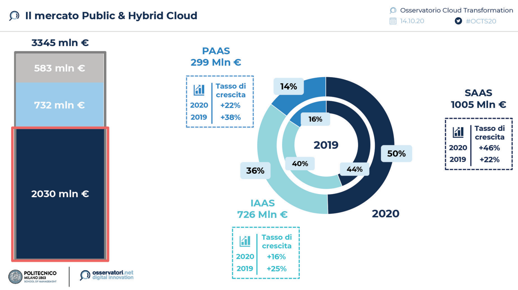 La componente Platform as a Service (PaaS) fa segnare un +22% e rappresenta il 14% del mix, guidata dalla crescita delle funzionalità abilitanti i Big Data Analytics a causa dell’aumento delle attività online (e quindi dei dati generati) nonché dalla necessità per tutti i settori di interconnettere i processi e monitorarli.