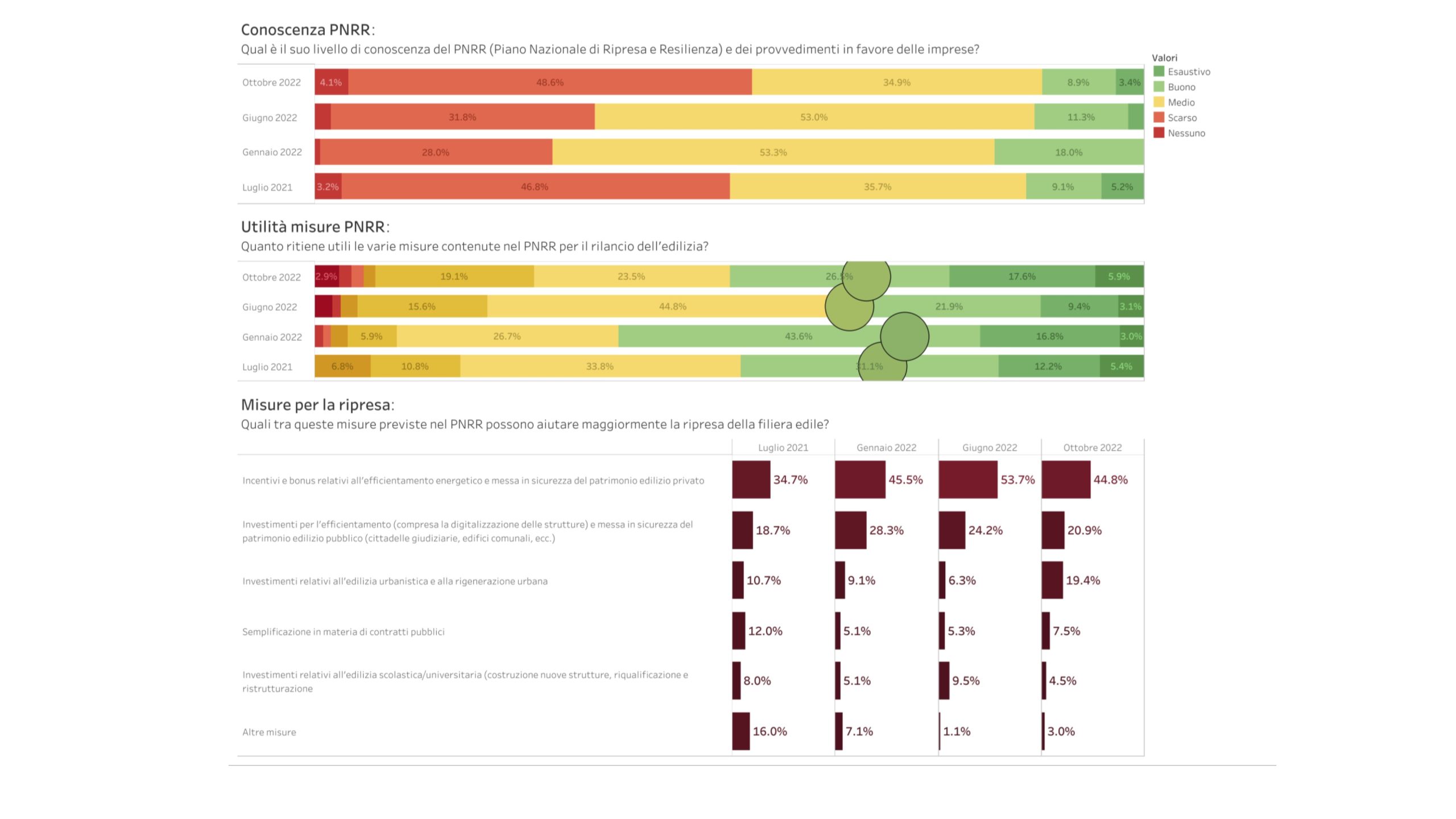 Per quanto riguarda il Pnrr, le imprese guardano con favore soprattutto a incentivi e investimenti relativi all’efficientamento energetico e alla messa in sicurezza del patrimonio edilizio sia pubblico che privato.