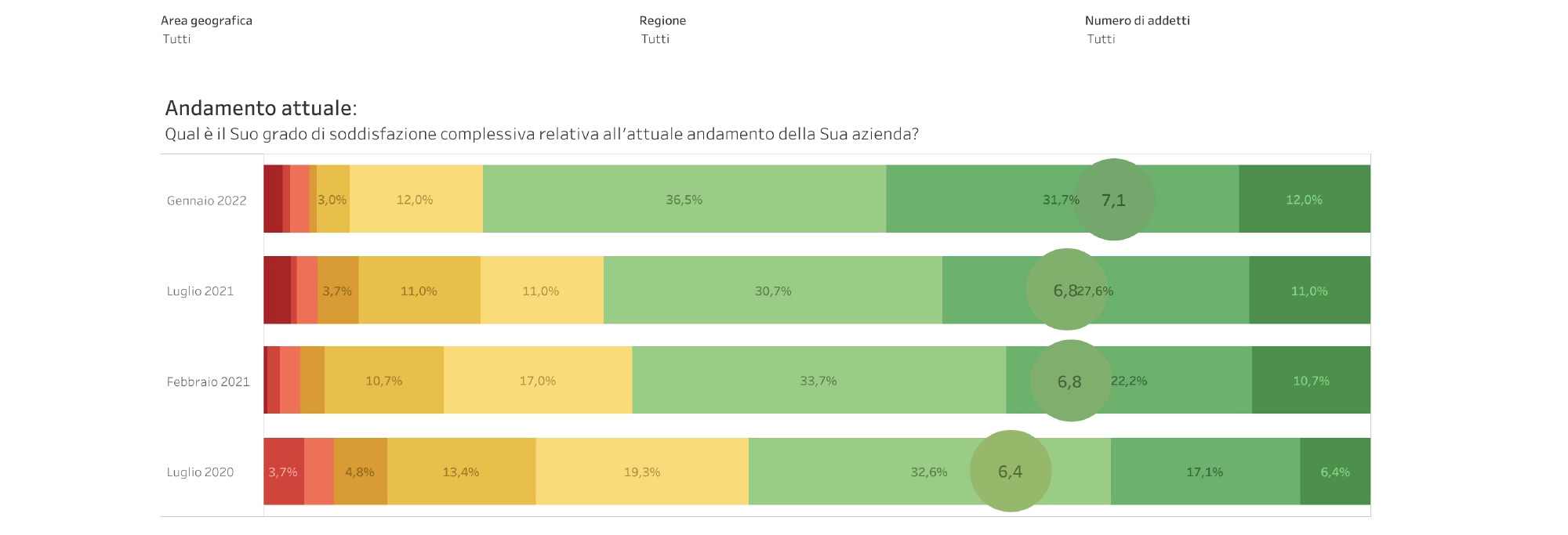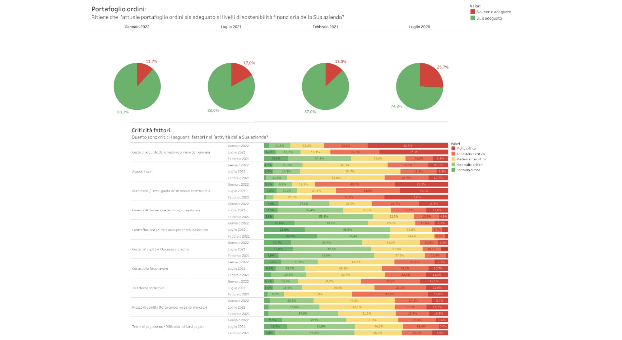 Non solo futuro, però. È già nel presente che le aziende vedono importanti cambiamenti. Lo testimoniano due numeri: la percentuale di realtà soddisfatte dell’attuale andamento generale dei propri affari, ben l’80%, il dato più alto mai registrato negli ultimi anni, e quello delle aziende soddisfatte del portafoglio ordini, l’88%.