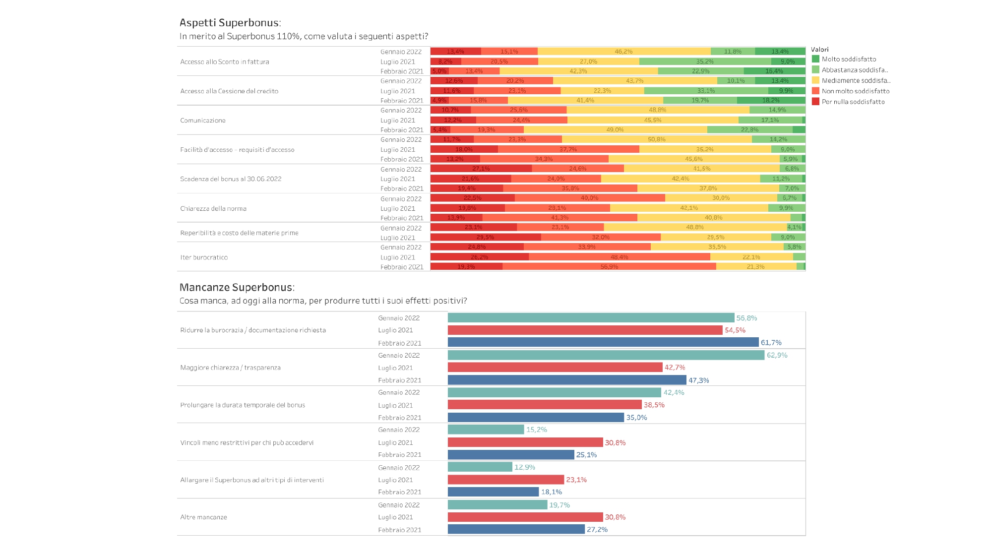 Occorre superare queste criticità, ma come? Le aziende puntano, oltre che sulla riforma della burocrazia/sburocratizzazione, soprattutto sugli incentivi. Sono tante (70%) le attività che hanno giovato del Superbonus 110%, con il 79% di esse che devono fino a un quarto del proprio fatturato proprio a questa misura. Di quest’incentivo apprezzano soprattutto l’accesso allo sconto in fattura e alla cessione del credito. Ma si può fare ancora di più: oltre metà delle imprese ritiene necessario ridurre la burocrazia e la documentazione richiesta e vorrebbe maggiore trasparenza. Tra gli altri incentivi, gli imprenditori preferiscono, inoltre, il Bonus ristrutturazione e l’Ecobonus.