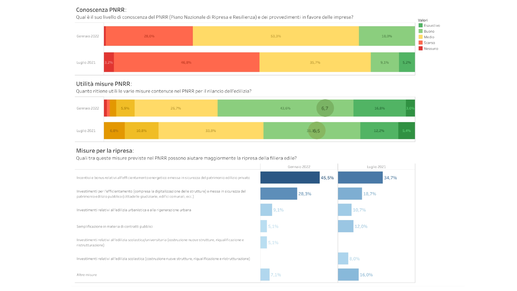 L’argomento del momento è sicuramente il Pnrr. Nonostante siano ancora in pochi a conoscerlo nel dettaglio (il 18%, in aumento rispetto al 14% di luglio), continuano ad aumentare le realtà che ritengono utili le misure contenute nel Piano (63% contro il 49% di luglio). Quali sono le più importanti secondo le aziende? Incentivi e bonus relativi all’efficientamento energetico e messa in sicurezza del patrimonio edilizio privato e pubblico (cittadelle giudiziarie, edifici comunali, eccetera).