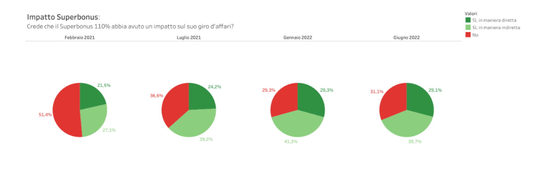 In questi mesi, un grande aiuto è arrivato dagli incentivi, soprattutto dal Superbonus 110%, che, in attesa di capire quale sarà il suo futuro, ad oggi ha determinato mediamente fino ad un quarto del fatturato per quasi 8 aziende su 10. Le difficoltà macroeconomiche si fanno sentire soprattutto sotto due aspetti: l’aumento dei prezzi del prodotto finito (per il 68% delle aziende) e i ritardi nelle consegne (60%).