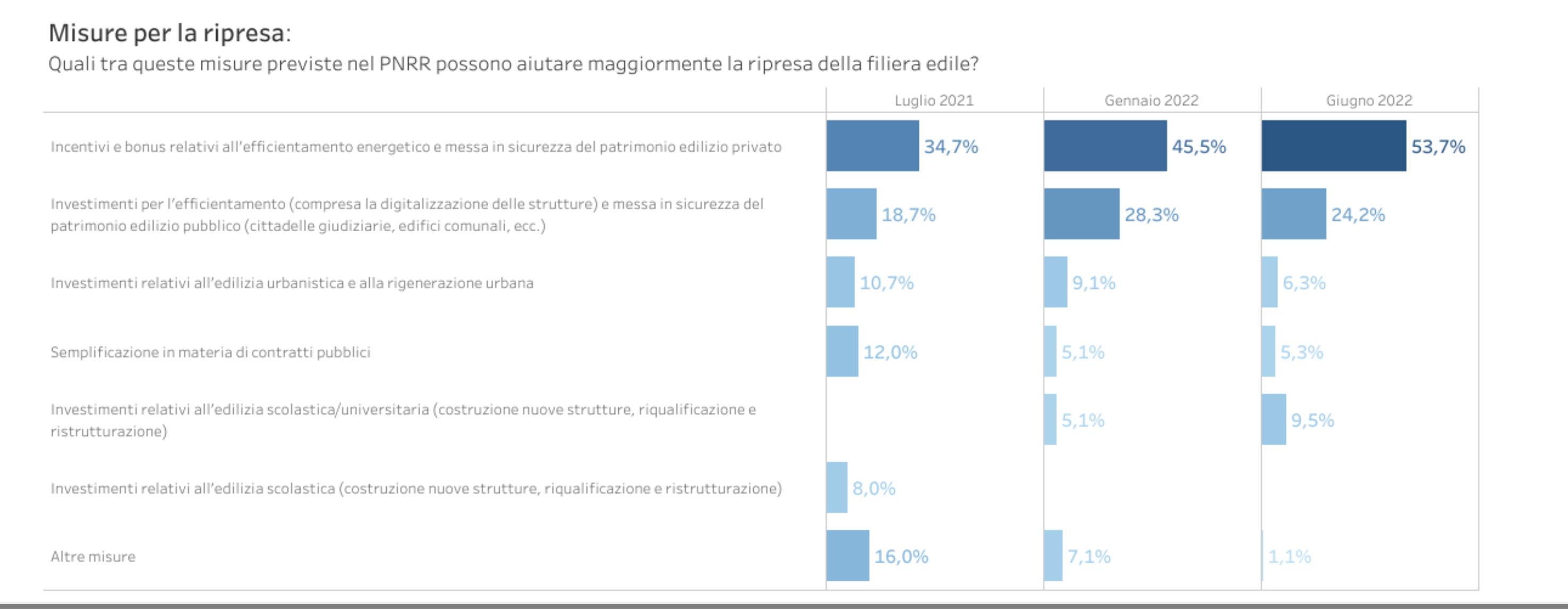 Cosa ha favorito la ripartenza del settore dopo anni difficili? Non sorprende che in cima alle risposte più gettonate ci siano gli incentivi, seguiti dalla riforma della burocrazia/sburocratizzazione e dallo sblocco dei cantieri. Parlando proprio di bonus, molti ritengono che il Superbonus 110% abbia avuto un impatto positivo sul proprio giro d’affari, anche se, secondo 6 aziende su 10, le difficoltà ad accedere allo sconto in fattura e alla cessione del credito rischiano di colpire il comparto. Per quanto riguarda il Pnrr, le imprese guardano con favore soprattutto a incentivi e investimenti relativi all’efficientamento energetico e alla messa in sicurezza del patrimonio edilizio sia pubblico che privato.