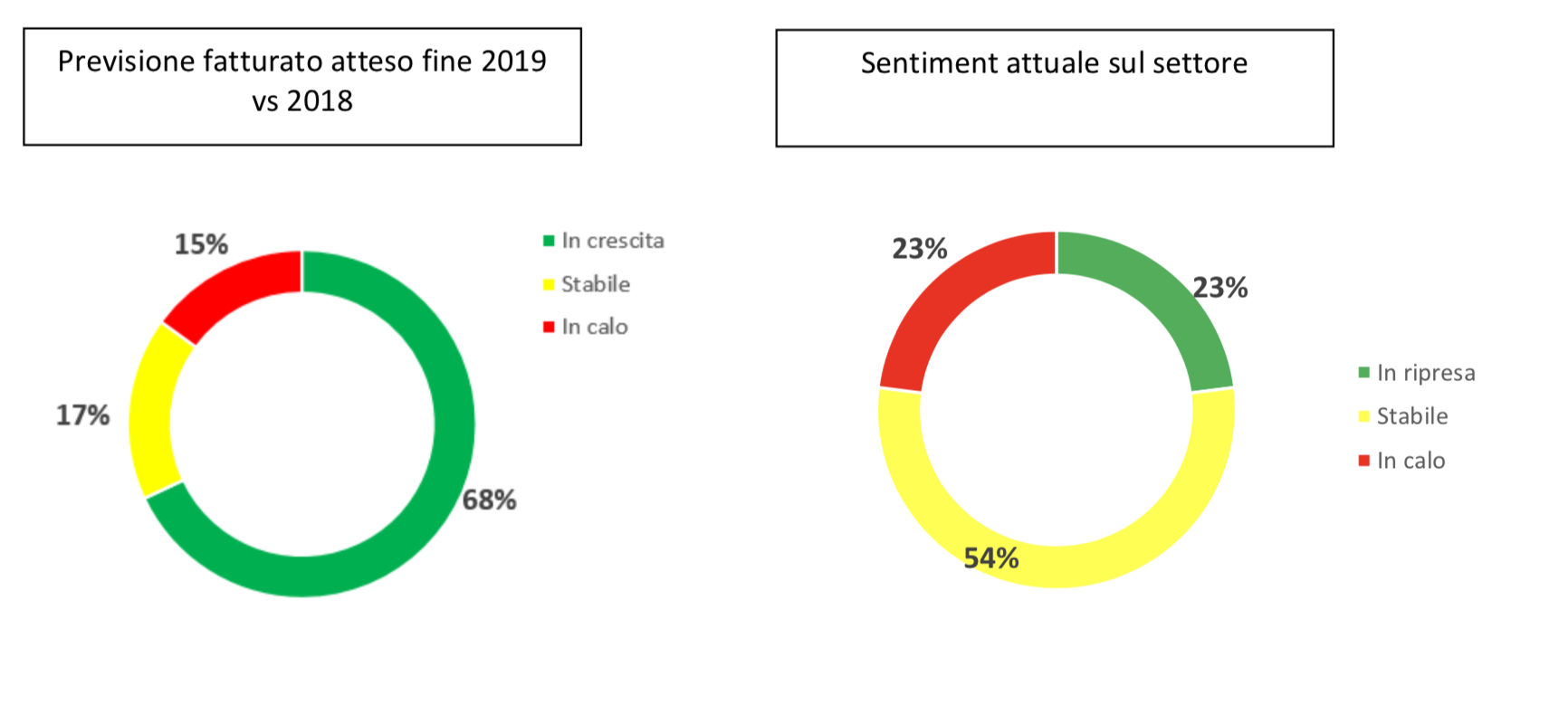 Nella prima metà del 2019, rispetto allo stesso periodo del 2018, quasi la metà (49%) del campione intervistato ha registrato una crescita del fatturato, e quasi tutte hanno mantenuto (56%) o incrementato (34%) l’occupazione. Positive anche le attese per la chiusura dell’anno in corso, con il 68% che si aspetta un ulteriore incremento dei ricavi e solo il 15% una contrazione. Tra i settori di sbocco maggiormente performanti si evidenzia quello delle ristrutturazioni (è anche il settore che impatta maggiormente sui ricavi totali), in crescita per il 51% del campione, mentre l’attività rivolta alla Pubblica Amministrazione risulta in flessione per il 48%.