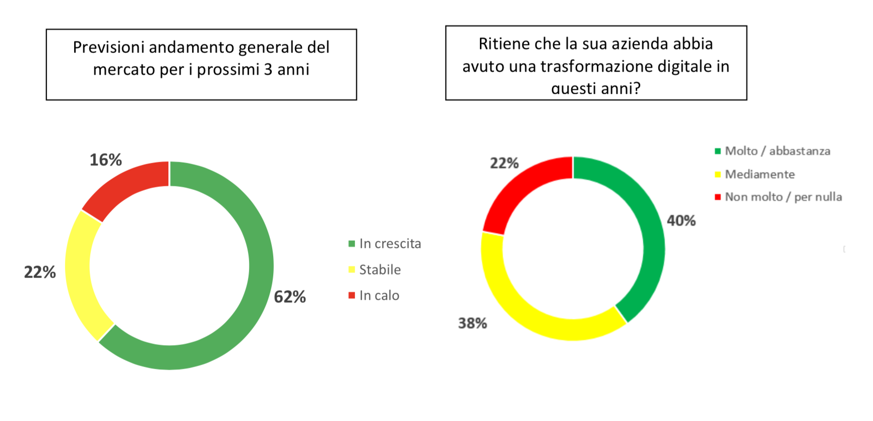 Il clima di fiducia è anche l’espressione del momento favorevole vissuto da tanti imprenditori. A livello generale, infatti, la maggior parte delle aziende definisce molto (55%) o mediamente (36%) soddisfacente il proprio andamento attuale (solo il 9% non ne è appagato). Le imprese più soddisfatte sono quelle di medie dimensioni, del Nord-Ovest e che producono macchinari o tecnologie. Inoltre, il portafoglio ordini è giudicato adeguato ai propri livelli di sostenibilità finanziaria (dal 62% delle imprese) e per quasi sette imprenditori su dieci, attualmente, il settore è in una fase di ripresa (23%) o comunque stabile (54%). Per il 23%, invece, il sentiment resta negativo. Meno dubbi sul futuro del mercato, con tanti (62%) convinti del suo sviluppo nei prossimi 3 anni.