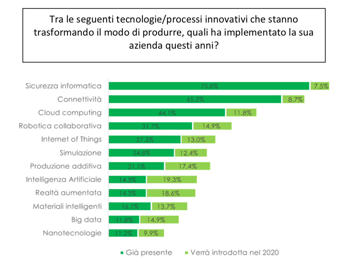 Un processo di cambiamento che negli ultimi anni ha già trasformato molto o abbastanza 4 aziende su 10, mentre solo il 22% è ancorato ai vecchi standard. Con riferimento agli investimenti in nuove tecnologie o processi innovativi, ad oggi le aziende hanno introdotto principalmente soluzioni per la sicurezza informatica (76%) e la connettività (65%), seguite dal cloud computing (44%), dalla robotica collaborativa (32%) e dall’Internet of Things (27%). L’intelligenza artificiale e la realtà aumentata, al momento poco impiegate, sono quelle che verranno maggiormente introdotte entro il 2020 (rispettivamente dal 19,3% e dal 18,6% delle aziende).