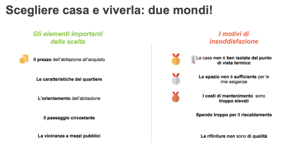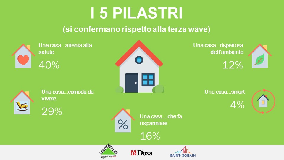 Lo studio, condotto su un campione di 1500 individui è stato sviluppato a partire dalla definizione di 5 pilastri, ovvero 5 aspetti su cui si concentra l’attenzione quando si parla di “casa ideale” quali la casa attenta alla salute, la casa comoda da vivere, la casa che fa risparmiare, la casa rispettosa dell’ambiente e la casa smart.