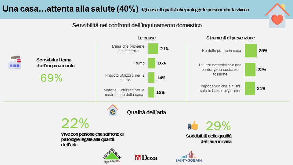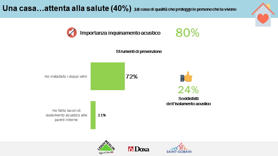 Dalla ricerca emerge che solo il 25% degli intervistati si dichiara soddisfatto della propria abitazione, mentre per quanto riguarda le maggiori cause fonte di preoccupazione sulla salubrità della propria casa ci sono l’inquinamento dell’aria interna (69%) e l’inquinamento acustico (80%), ma le soluzioni per combattere i due fenomeni non sono conosciute come si potrebbe immaginare.
