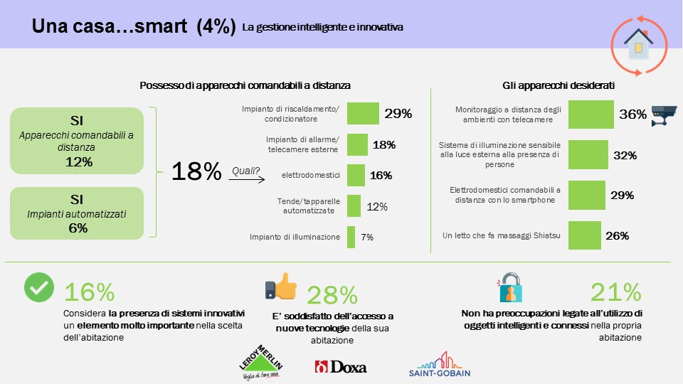 Bassi anche gli indici legati al tema dell’ecosostenibilità: solo il 21% è soddisfatto della qualità dei materiali di costruzione della propria casa e solo il 15% ha installato pannelli fotovoltaici sulla propria abitazione (o è in procinto di farlo). La casa intelligente, ovvero quella dotata di apparecchi comandabili a distanza, inoltre non è ancora nel cuore di tutti gli italiani, tuttavia il 16% considera la presenza di sistemi innovativi un elemento molto importante nella scelta della casa. Tra gli apparecchi più desiderati ci sono quelli utilizzati per il monitoraggio a distanza degli ambienti.
