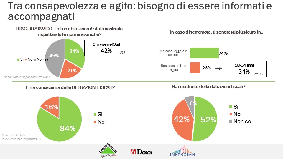 Nota dolente, infine, i dati relativi al tema del rischio sismico e quello dell’utilizzo degli incentivi fiscali. Ne primo caso nonostante gli accadimenti degli ultimi anni, il 13% degli intervistati non sa se vive in una zona sismica, mentre il 45% non sa se la propria abitazione è stata costruita rispettando norme antisismiche.