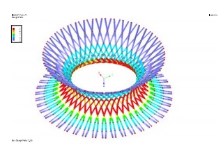 Anello e copertura d’acciaio. I caratteristici elementi decorativi sono composti da due gruppi di travetti di dimensioni 12×8 cm interrotti in mezzeria. Il rocchetto è ricavato partendo da questi pezzi ed è costituito da 42+42 elementi ottenuti ruotando i travetti di partenza di 36°. In corrispondenza dell’interruzione tra i travetti è posizionato un anello realizzato con un profilo Upn400 che sostiene gli elementi e su cui è posizionata una copertura in acciaio. Questo profilo è supportato da tre colonne realizzate con tubi metallici di diametro 244.5 mm e spessore 5 mm.