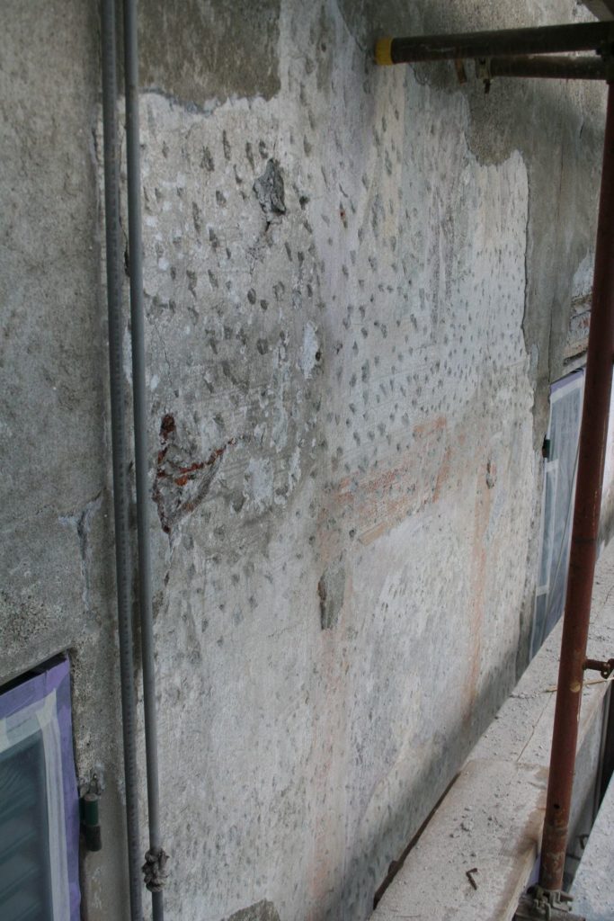 Nel caso descritto la caduta e in parte la rimozione dell’intonaco fortemente ammalorato ha messo in evidenza la superficie decorata della facciata del XVI secolo. Tale intonaco mostrava ampie porzioni decorate in cui era ancora possibile individuare colori e apparati figurativi.