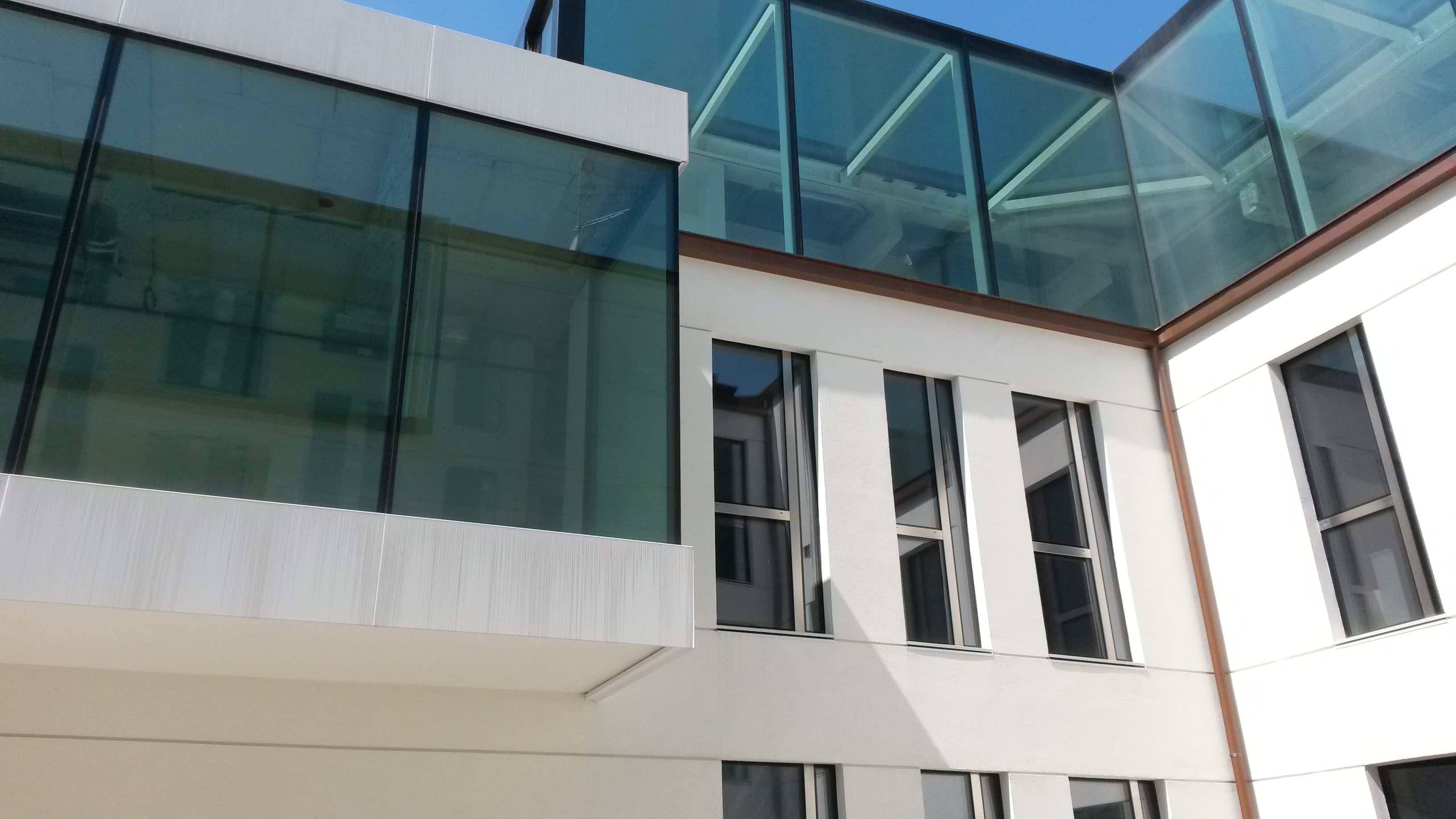 Copertura vetrata della terrazza. La terrazza prospiciente la corte interna è stata protetta da una struttura in vetro su telaio in acciaio, realizzati da tubi 160 x 60 x 6 mm fissati alla muratura esistente e alle travi in calcestruzzo armato a sbalzo per mezzo di piastre di acciaio sagomate. Per sopportare l’incremento di carico, il telaio esistente è rinforzato con fibre di carbonio. I telai sono stati saldati in officina mentre il tubo di collegamento fra i montanti è stato saldato in opera.