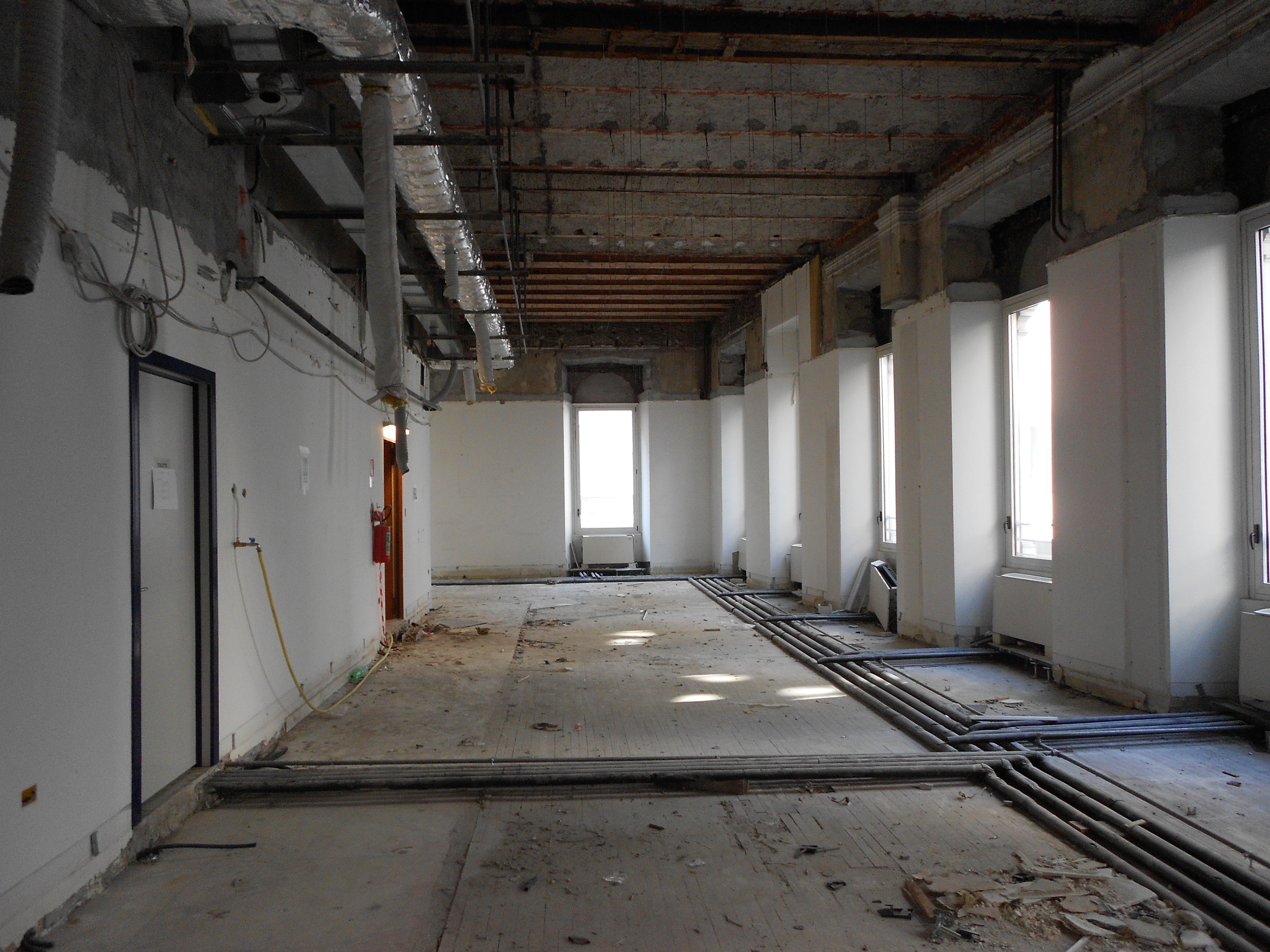 Nuova sala uffici a sbalzo. Al piano quarto è stato realizzato un nuovo solaio a sbalzo di circa 2 m con travi in acciaio Heb 200 appoggiate sulla muratura. Gli orizzontamenti sono in lamiera grecata con cappa integrativa, non collaborante con le travi. Al piano quinto è stata realizzata la copertura della sala. Per permettere la massima flessibilità nella disposizione delle vetrate verticali e in modo particolare nel passo dei montanti, solaio di calpestio e di copertura sono fra loro indipendenti.