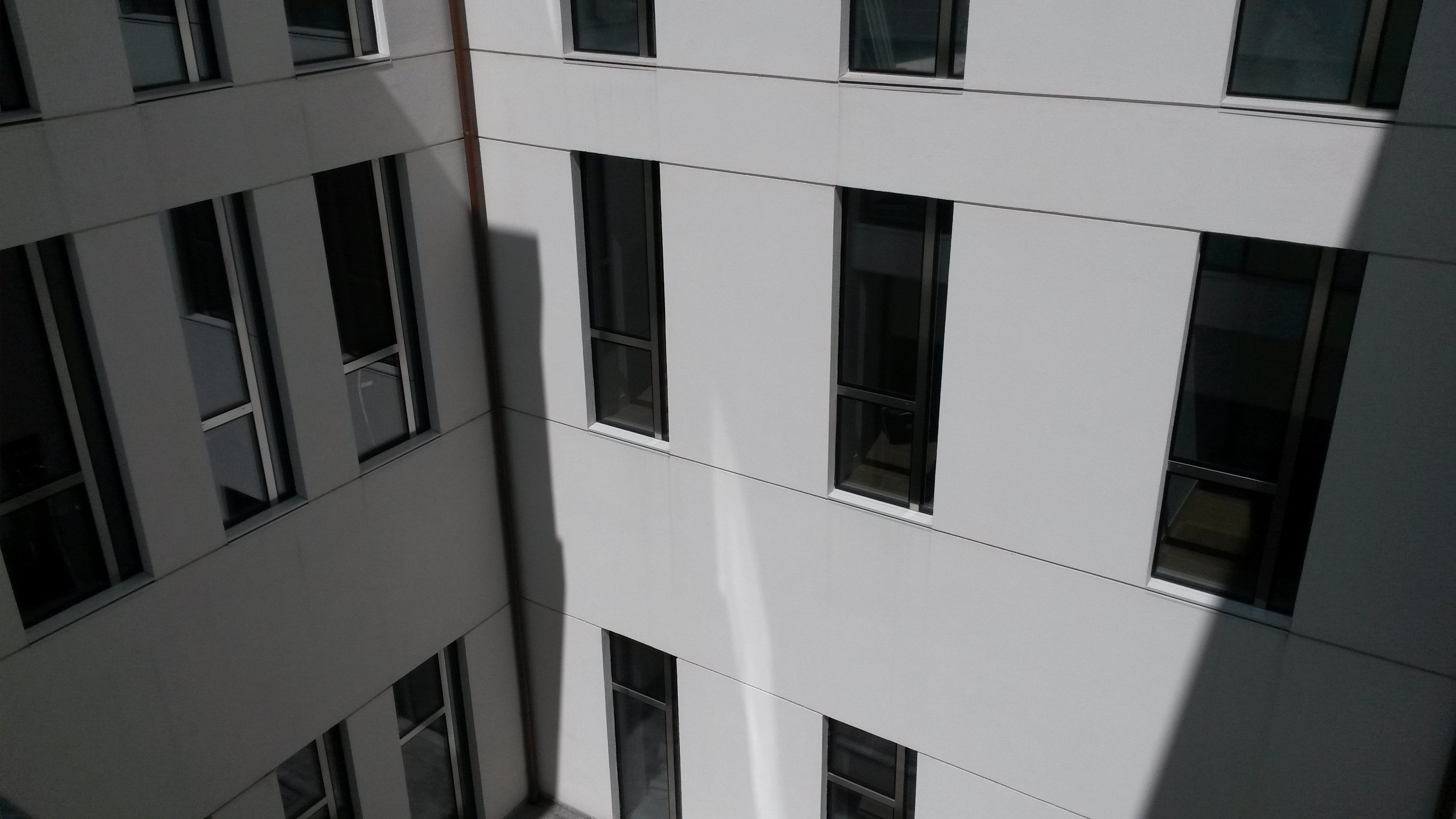 Al piano quarto è stata realizzato un piccolo volume a sbalzo interamente vetrato destinato a sala riunione. Al piano quinto, la chiusura perimetrale della balconata è stata eseguita mediante l’impiego di elementi vetrati sia orizzontali che verticali. Le pareti vetrate e i serramenti sono realizzati in acciaio verniciato bianco e vetro trasparente colorato verde chiaro. Internamente, le facciate sono state termo-isolate attraverso strato isolante con finitura a intonaco al quarzo con una tonalità di bianco.