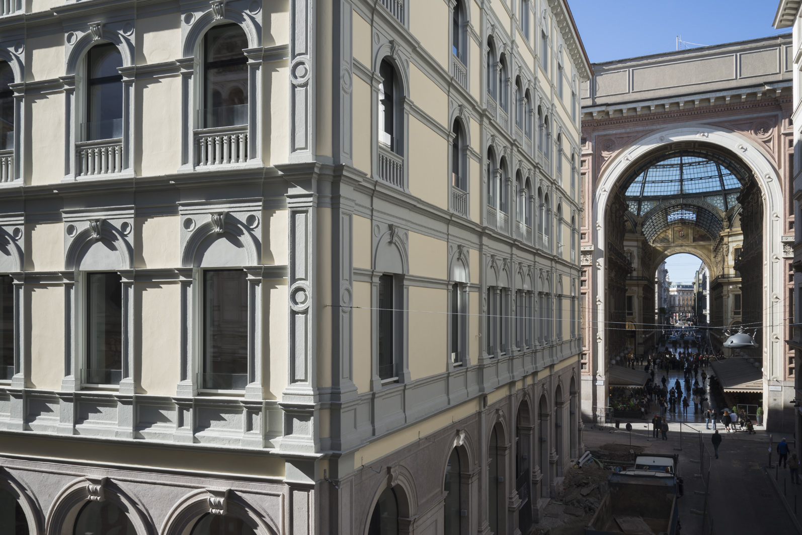 Accessi. Gli accessi son stati rivisti in base alle nuove funzioni e ai possibili tenant sia degli spazi commerciali che degli spazi a uso uffici e abitativi; l’ingresso condominiale per i piani superiori è stato spostato su via San Raffaele, avvicinando l’ingresso stesso al vano scala esistente dotato di ascensori, e portando l’ingresso principale dello spazio commerciale su via Berchet, dando un maggior risalto dello spazio stesso che si imposta su una nuova prospettiva centrale.