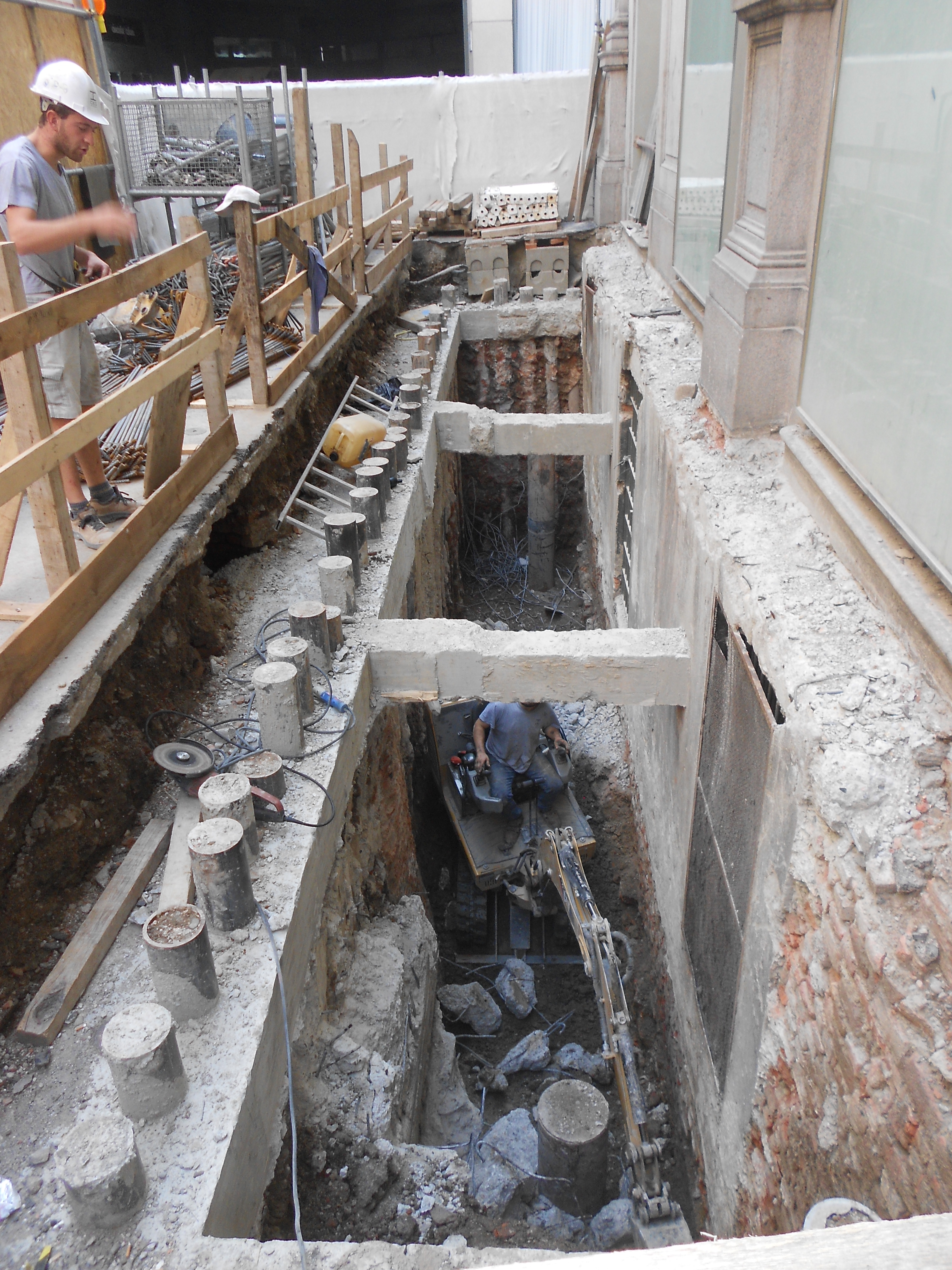 Nuovi impalcati in acciaio al piano terra e mezzanino. In una porzione limitata del piano terra è stato rimosso il pre-esistente solaio e realizzato un nuovo in acciaio ai fini di introdurre nuovi ascensori e nuove scale. Il pre-esistente piano ammezzato è stato rimosso e sostituito da un nuovo impalcato in acciaio, realizzato da lamiera grecata e getto integrativo. La lamiera è stata posata e semplicemente fissata alle travi, pertanto il sistema trave-soletta non è stato considerato collaborante ma ciascuna struttura svolge autonomamente il proprio ruolo. Nella zona centrale il solaio è stato opportunamente interrotto a costituire il vano di due scale in acciaio che collegano il piano terra con il piano ammezzato.