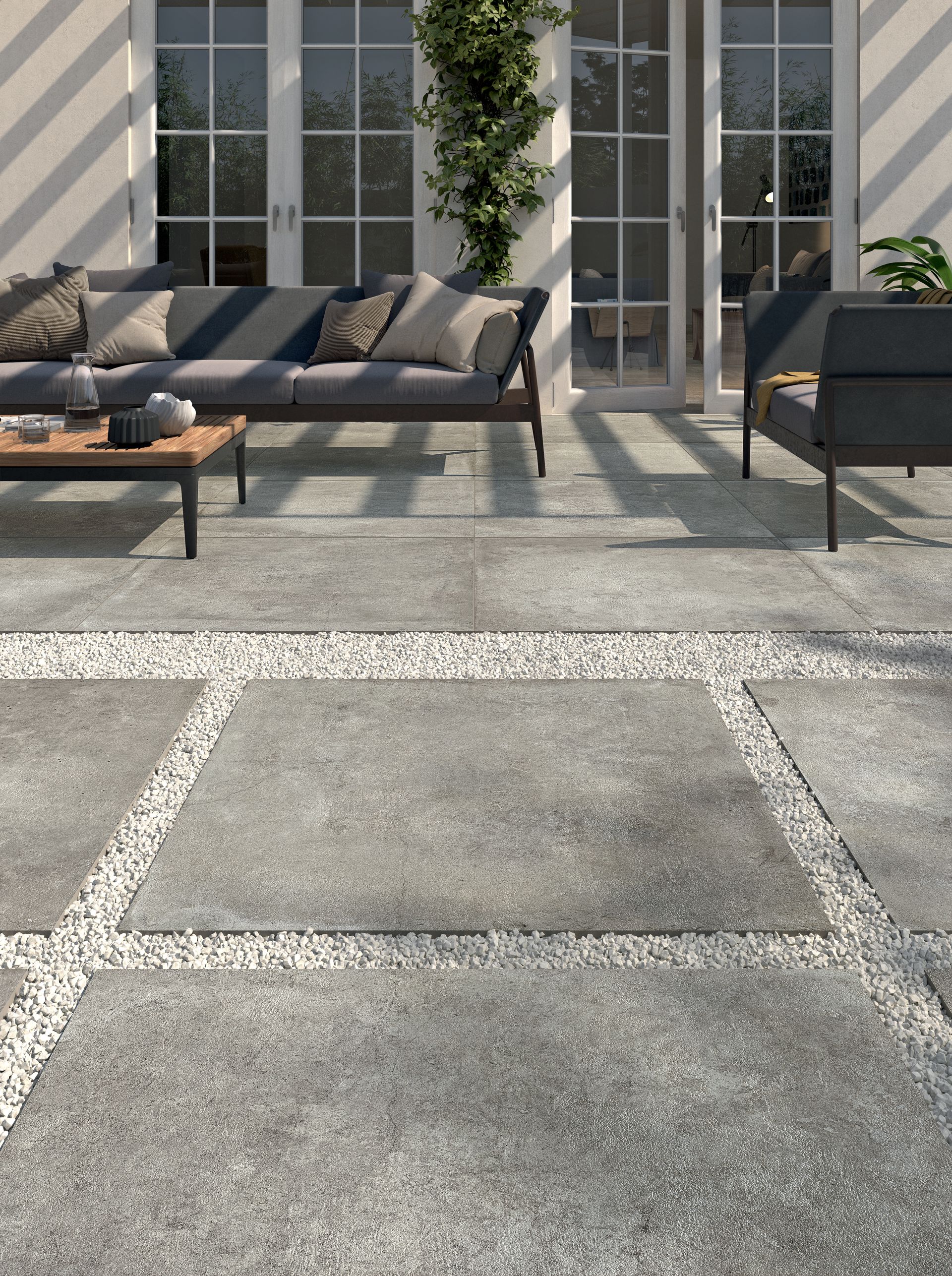 - Outdoor: gres spessorato 20mm: 90×90 cm; gres tradizionale: 60×60– 30×60 cm