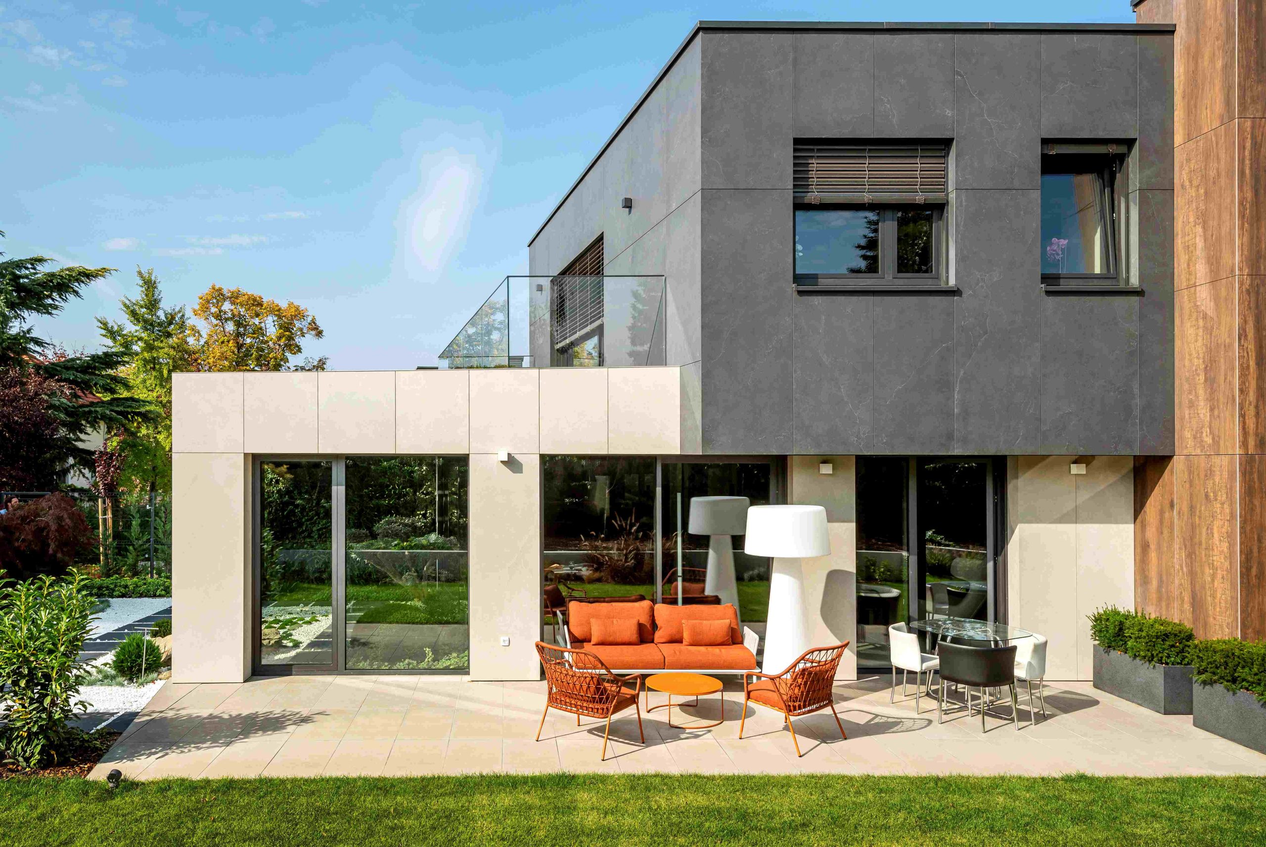 Protagonisti del progetto elaborato dagli architetti Zoltan Bagi per gli esterni e Szilvia Karolyi per gli interni, sono i pavimenti e i rivestimenti di 3 brand di Panariagroup. A partire dalla suggestiva facciata ventilata dove sono presenti rivestimenti in Kerlite (3,5 mm) di Cotto d’Este, in cui le tre tonalità utilizzate si alternano armoniosamente, creano un effetto elegante e contemporaneo. Al centro spicca la sezione effetto legno scuro color Noce della collezione Forest che, grazie al grande formato (3x1m), si inserisce perfettamente in questo contesto. Per le altre due sezioni della facciata, la scelta è ricaduta sulla collezione Lithos, sempre di Cotto d’Este.