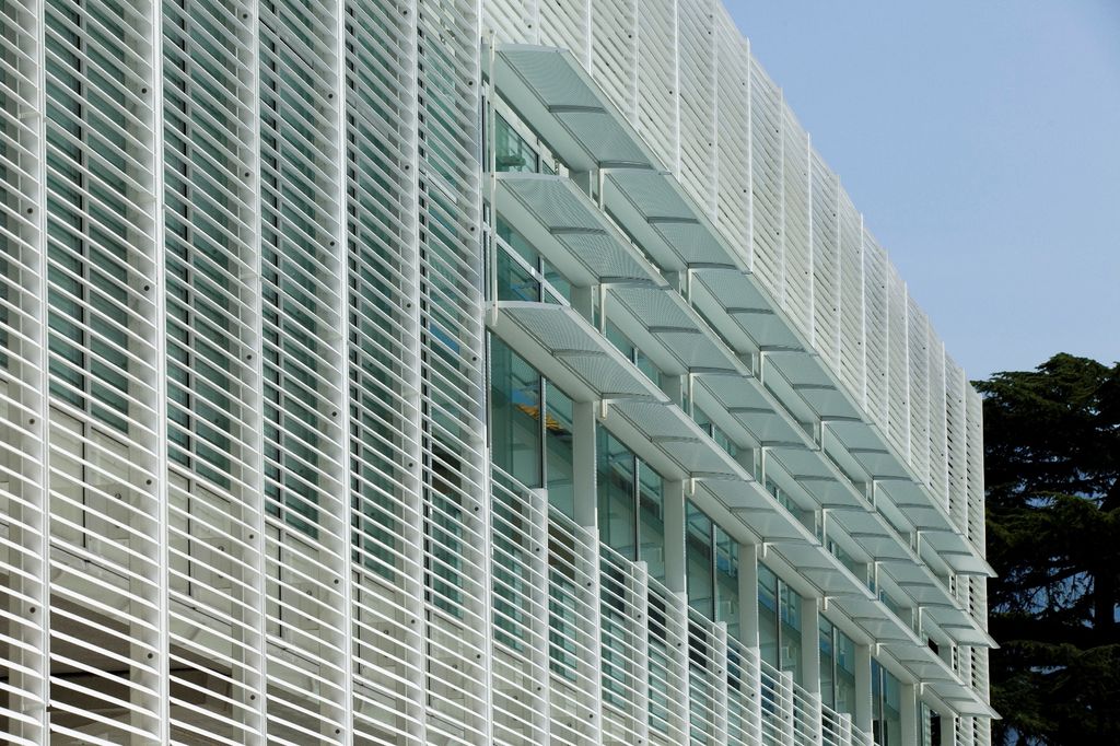 La nuova sede è composta da un kit modulare di elementi strutturali in cemento e da elementi performanti leggeri in alluminio, acciaio e vetro per gli involucri. Agli elementi prefabbricati in cemento si sovrappongono layer studiati per rispondere alle diverse esigenze prestazionali dell’involucro, quali esposizione, isolamento e intercettazione energetica.Tali layer sono costituiti da elementi trasparenti e opachi, da brise-soleil filtranti e fotovoltaici che consentono un migliore controllo dell’irraggiamento. Per il contenimento dei consumi energetici e delle emissioni di CO2 sono state utilizzate come “generatori” le risorse energetiche rinnovabili presenti nel luogo: acqua, sole, aria. La climatizzazione è affidata a un sistema modulare di pompe di calore che utilizzano l’acqua di falda. Sulle coperture sono stati posizionati pannelli fotovoltaici per la produzione di 20 kW di energia elettrica, collettori solari termici per la produzione di acqua calda e un rotore eolico.
