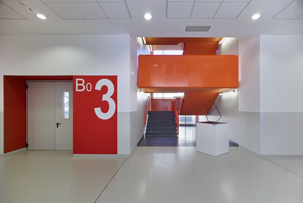 Il colore, bianco RAL 9016, il bianco della carta da disegno (progetto), tinge gli involucri rappresentando la purezza e la castità intellettuale della cultura tecnica in divenire». La sobrietà dell’esterno si ammorbidisce negli interni, dove compare il colore – giallo in un corpo, rosso nell’altro, ognuno con le proprie sfumature – a individuare ora i collegamenti verticali, ora gli ingressi alle aule, ora alcuni degli arredi. Nel complesso l’atmosfera è ordinata e stimolante, controllata e vivace al tempo stesso. Gli edifici oggetto di recupero sono invece la piccola villa, ex sede degli uffici amministrativi dell’ospedale, che oggi ospita gli uffici del Pro-rettorato, e il “corpo a pettine”, un tempo destinato alla degenze e oggi sede dei locali tecnici, dei depositi, degli uffici amministrativi, dipartimentali e di servizio alla didattica. Il recupero è avvenuto nell’ottica della salvaguardia della struttura, con una sola concessione al linguaggio contemporaneo sulle testate a nord-ovest, ora completamente a vetri.