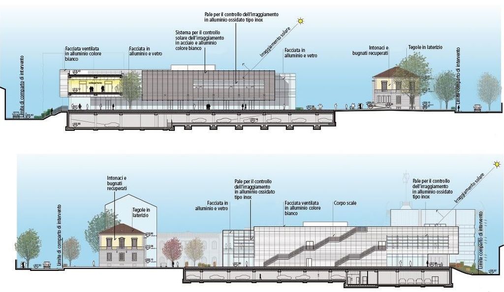 Entrambi in acciaio e vetro, sono caratterizzati da uno sviluppo lineare e da una schermatura costituta da elementi a palpebra che si muovono in funzione dell’illuminazione naturale. «L’immagine dell’edificio a L viene percepita per le sue qualità di leggerezza, trasparenza, luminosità, permeabilità prospettica, ma al contempo si impone in forma silente come simbolo di cultura e spirito innovativo – continua Bodega. I materiali e i colori utilizzati sono attinti dalla ꞌtavolozza cromomatericaꞌ legata alla storia del luogo e alla loro simbologia.