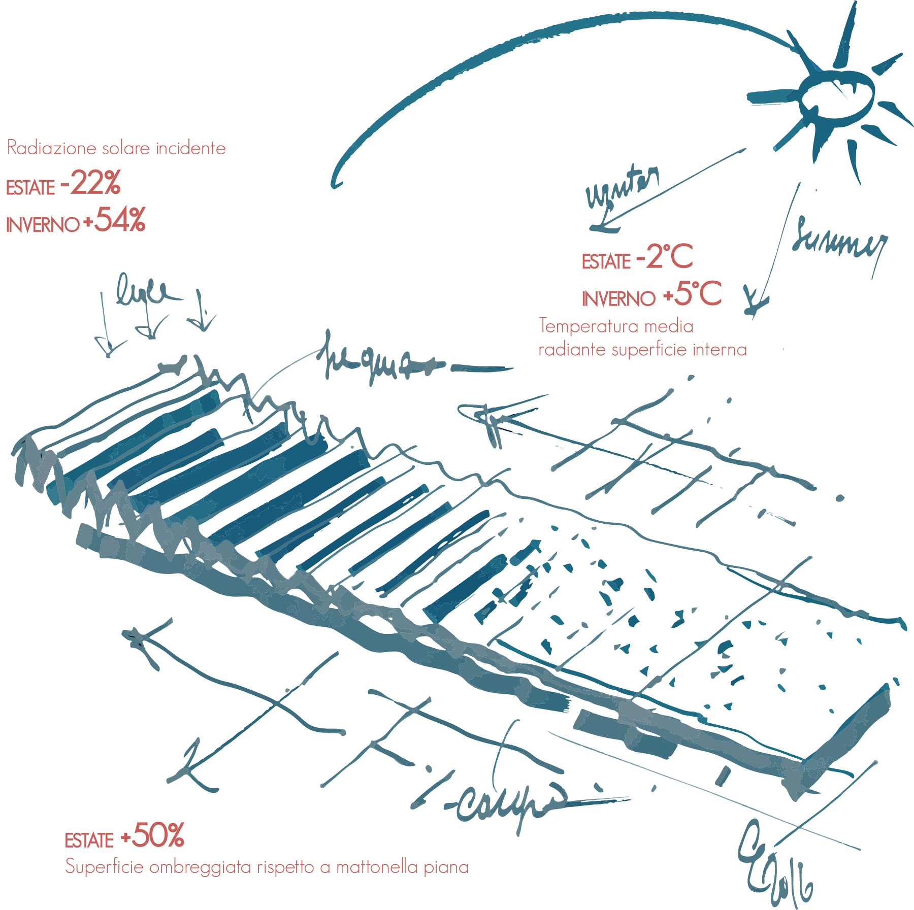 I pattern di piegatura aumentano progressivamente di frequenza e di altezza per comporre facciate che variano a seconda della luce, capaci di aumentare il comfort abitativo interno durante l’arco dell’anno. Le pieghe riducono le temperature estive grazie all’auto-ombreggiamento e aumentano la superficie per ricevere maggior irraggiamento nelle stagioni invernali.