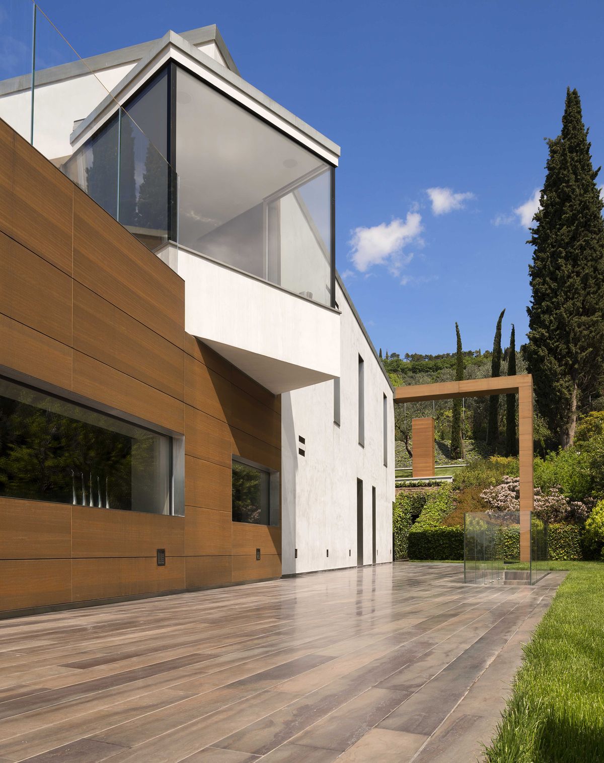 Woodstone Collection è l’originale linea di Antolini alla quale fa parte la soluzione ‘Elegant Brown’, declinata nella finitura Lether di Freewood design, scelta per incorniciare in esterno questa villa dal taglio contemporaneo.