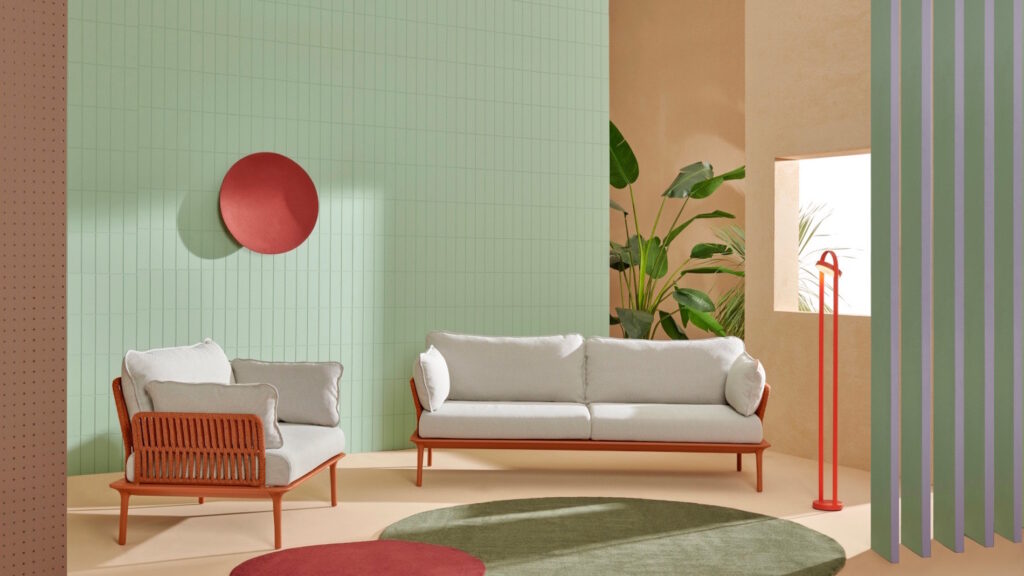 Oltre ai divanetti troviamo le poltroncine Panarea firmate da CMP Design. Le poltroncine di Pedrali prendono ispirazione dal paesaggio costiero mediterraneo e dai suoi colori: lo schienale è intrecciato in corda di polipropilene che, nella sua originale geometria, crea una raffinata greca e avvolge il tubo del telaio in acciaio, coprendo anche i braccioli. Completano questo raffinato set i tavoli Lunar, il cui design è curato da Pio e Tito Toso.
