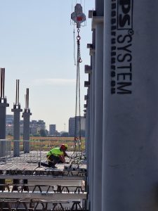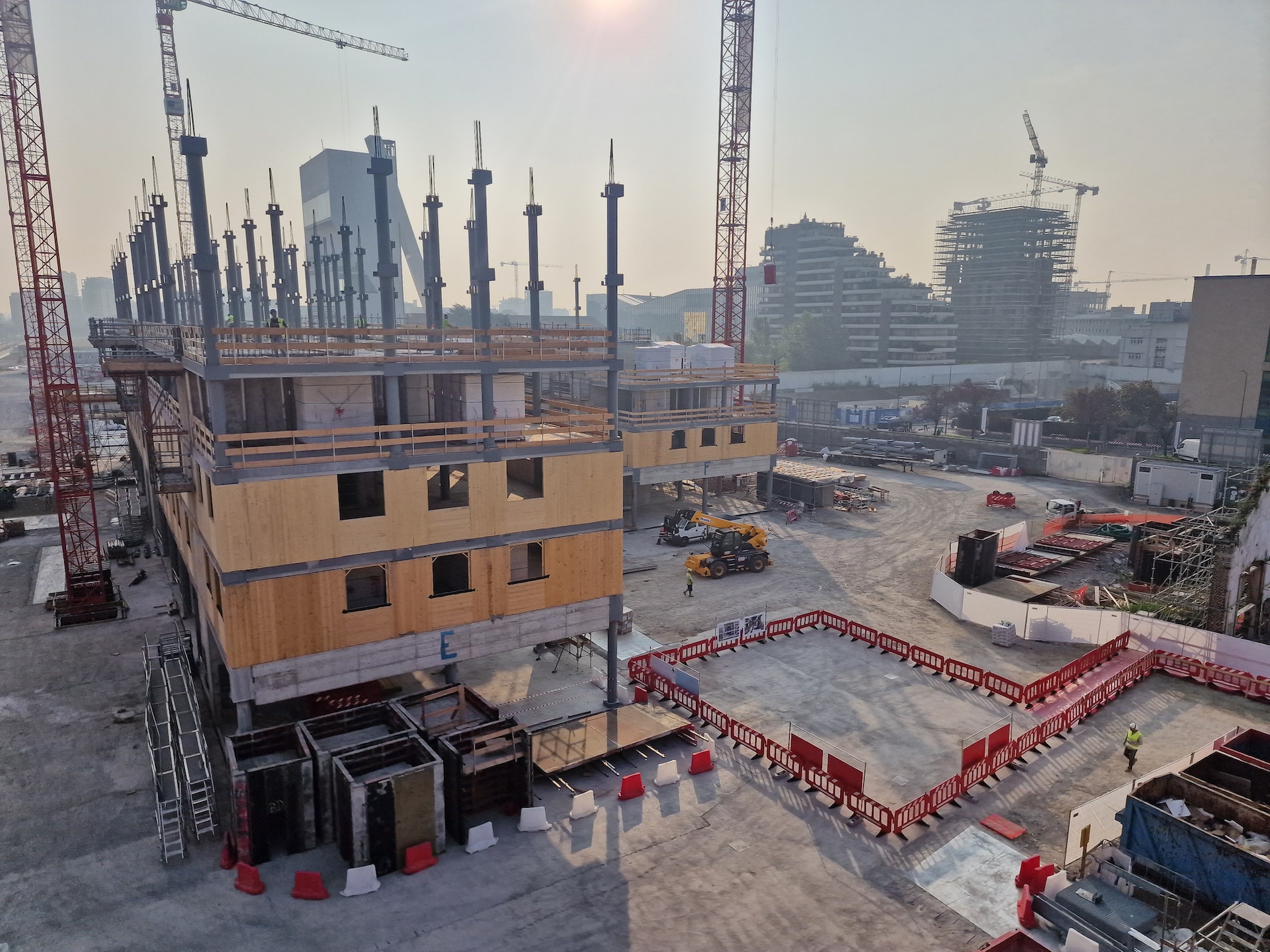 Entrando in cantiere si percepisce subito la differenza da un cantiere tradizionale: meno manodopera presente e, invece, una lunga teoria di bilici che entrano ed escono per trasportare pilastri e travi in acciaio, solai in calcestruzzo, rampe scala prefabbricate, cellule bagno prodotte in stabilimento già impacchettate e pannelli di tamponamento in legno XLam, anch’essi realizzati in azienda.