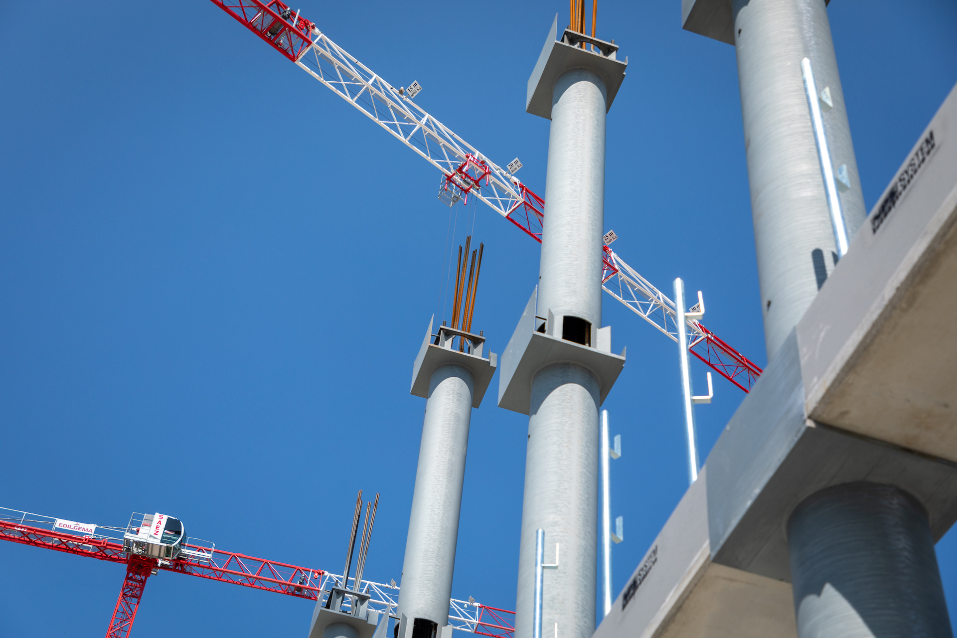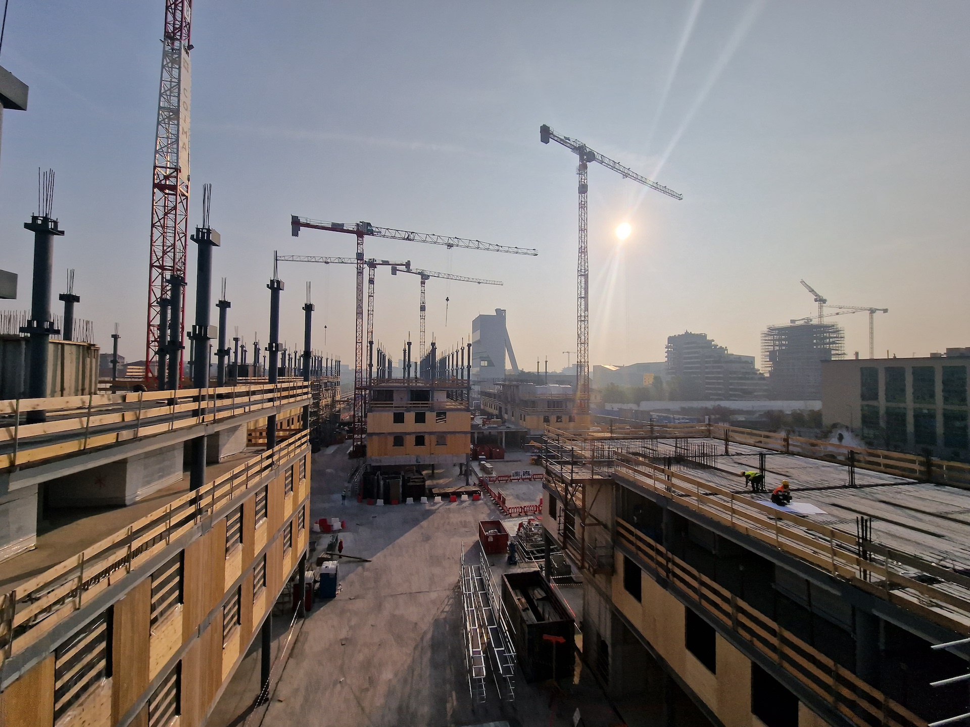 Il pronti via è stato da finale di discesa libera: contratto d’appalto firmato il 22 dicembre e avvio immediato delle fondazioni e del primo solaio, seguito dai lavori di elevazione delle strutture prefabbricate delle palazzine, di otto piani ciascuna, più un interrato di 25mila metri quadrati che funzionerà come parcheggio delle auto, locali magazzino e tecnici e di servizi generali del nuovo quartiere. Il volume a quota meno uno sarà l’unica porzione del complesso a essere stata realizzata in tradizionale: tutto il resto delle strutture, che crescono giorno dopo giorno, settimana dopo settimana, è frutto della produzione in stabilimento.