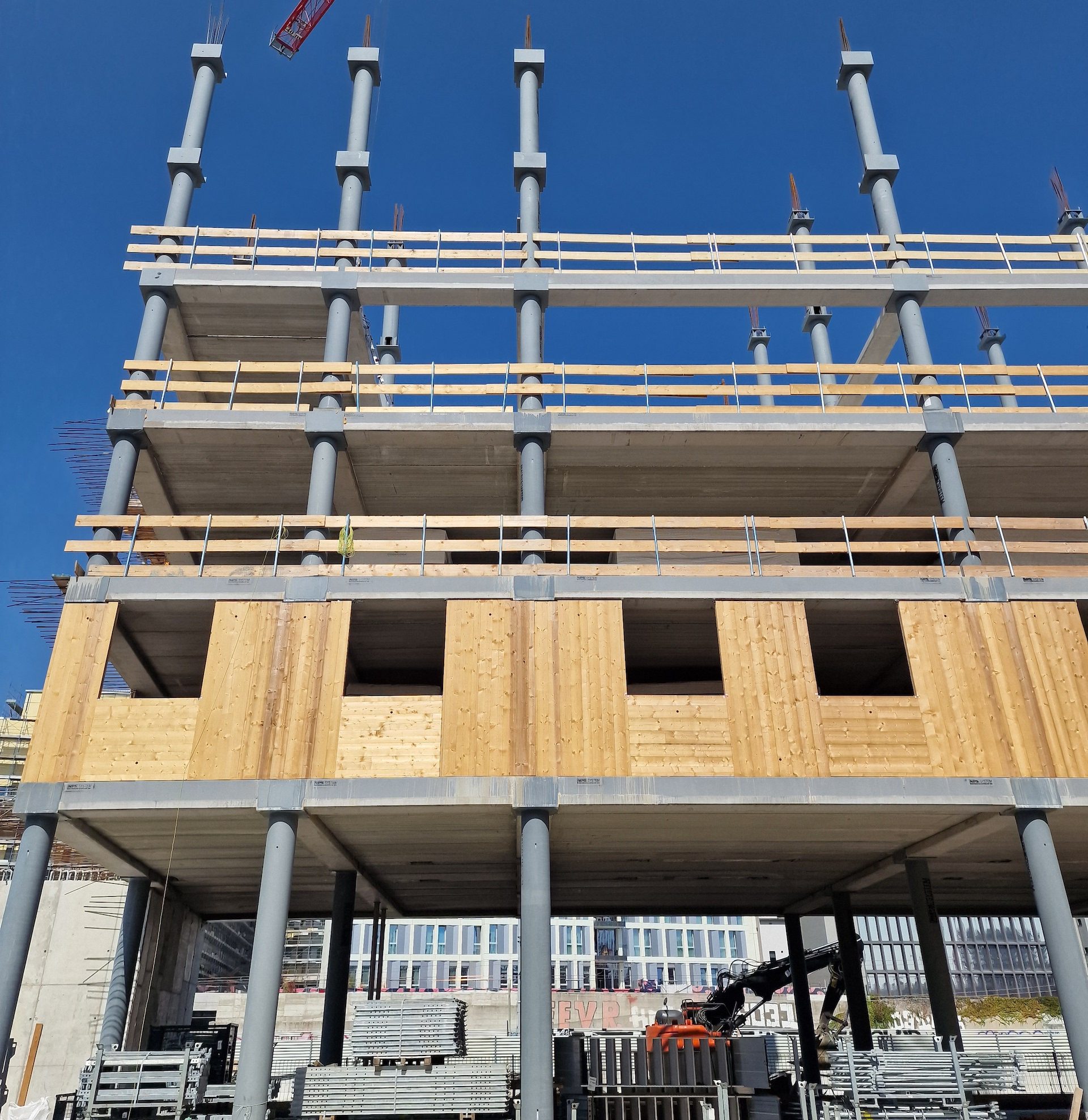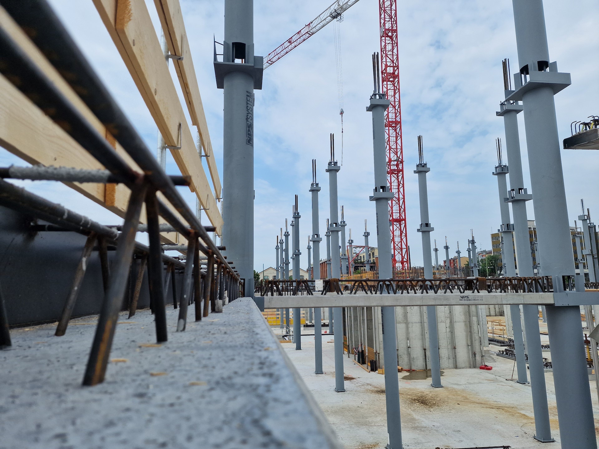 Per la parte strutturale degli edifici è stato impiegato il sistema Nps, un sistema modulare completo e flessibile, che si compone di travi e pilastri misti acciaio-calcestruzzo, prodotti con acciaio riciclato fino al 93% e dotati di dichiarazione ambientale di prodotto (Epd). Sono realizzati in stabilimento, vengono montati in cantiere in totale autoportanza, non hanno la necessità di casserature e puntellazioni provvisorie: in questo modo il cantiere procede veloce. Dopo il getto di completamento, il sistema dà vita a una struttura mista, con caratteristiche aderenti ai livelli prestazionali previsti dagli Eurocodici e dalle norme italiane Ntc 2018.