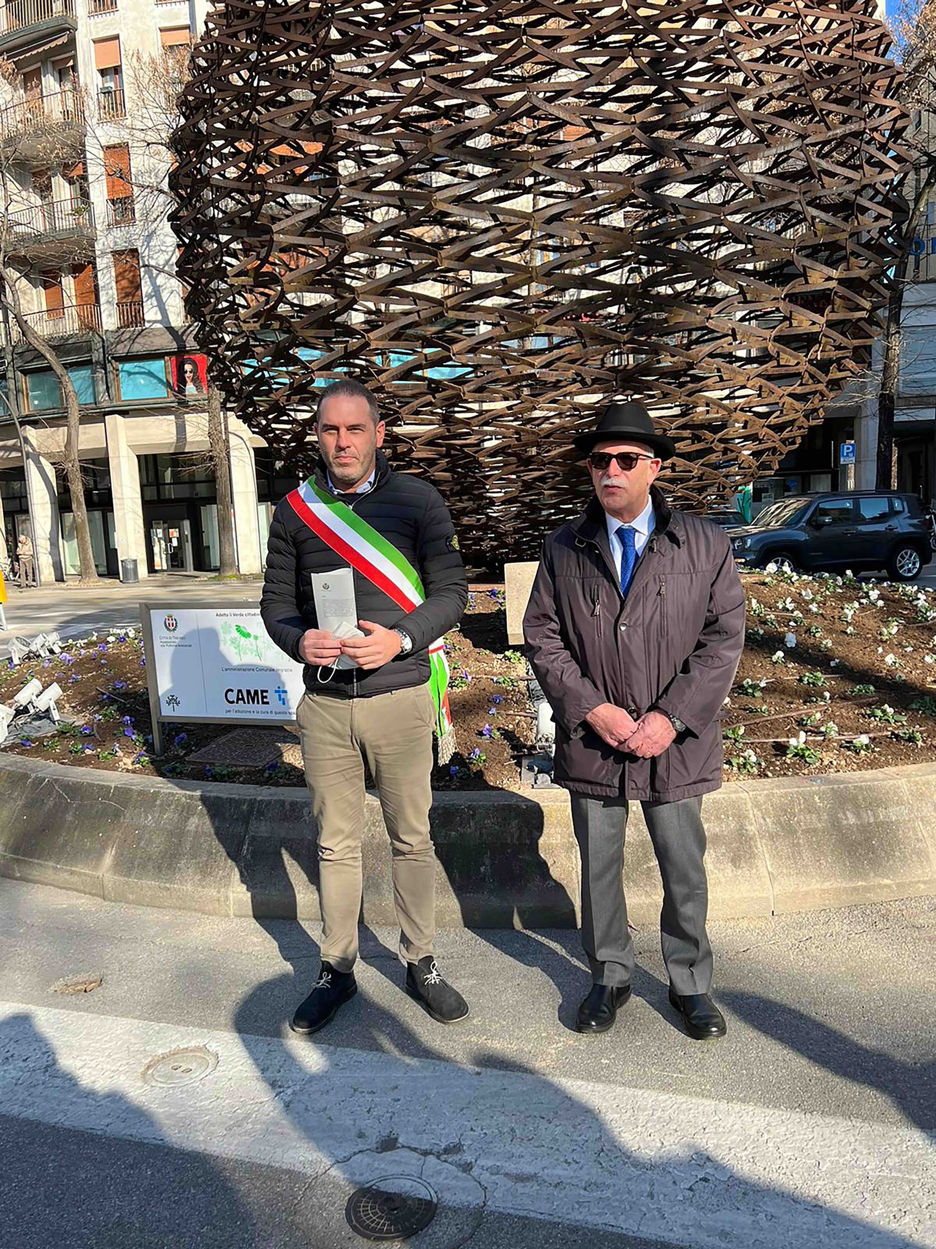 Came | Paolo Menuzzo, fondatore Came e Alessandro Manera, assessore, davanti alla Sfera di Toni Benetton.