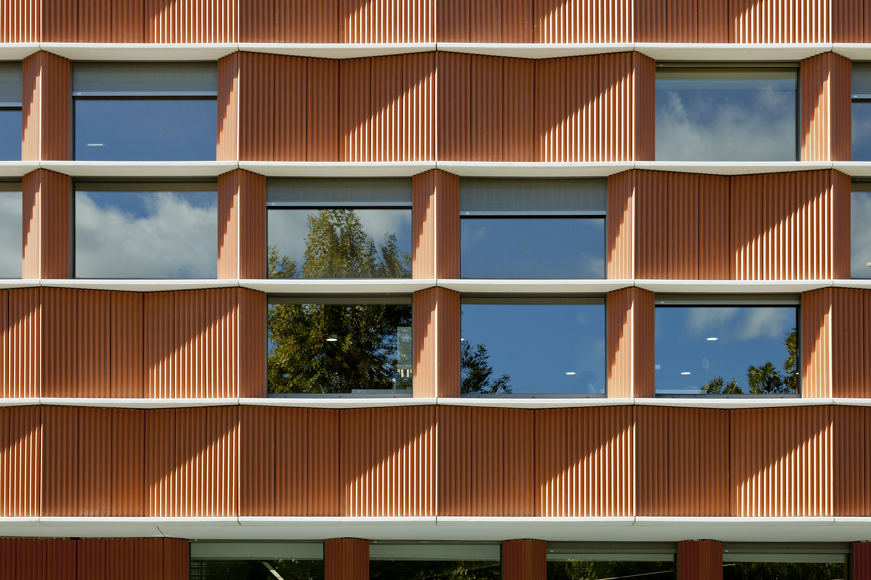 Essa è costituita da facciate ventilate con elementi verticali in laterizio estruso, caratterizzate da un andamento particolare lungo tutti i fronti, dando così un aspetto unitario e continuo all’intervento. Ogni elemento in laterizio è ancorato puntualmente a una piastra orizzontale bianca, fissata a sua volta al cemento armato, con un sistema di livellazione e di facile controllo che permette l’eventuale sostituzione dei laterizi.