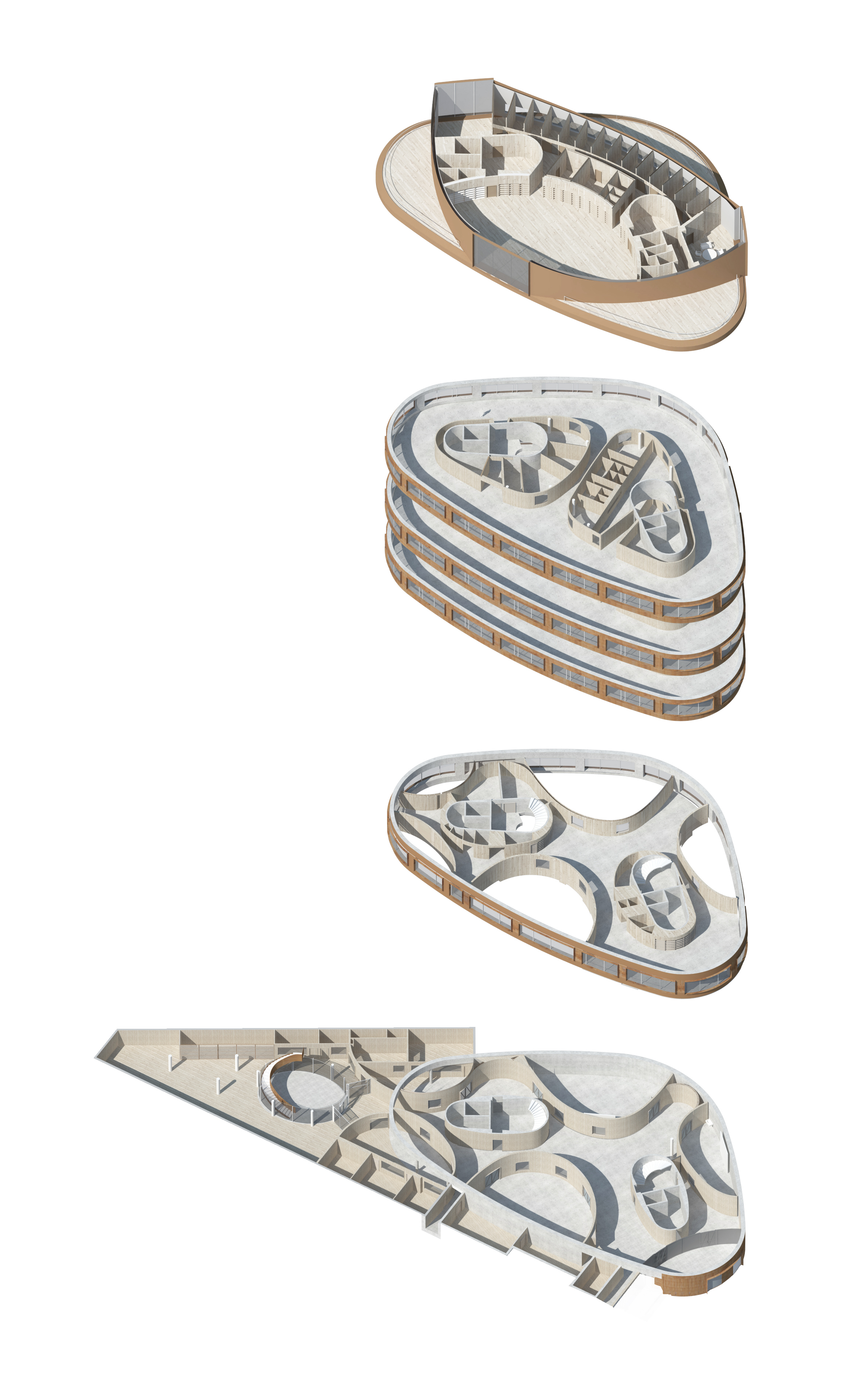 La pianta centrale ha uno sviluppo vagamente triangolare, che ha consentito la creazione di una serie di percorsi dall’andamento molto morbido lungo il perimetro. La presenza delle pareti curve è volta a ricavare un flusso continuo di spazi che accentuino il senso di apertura.