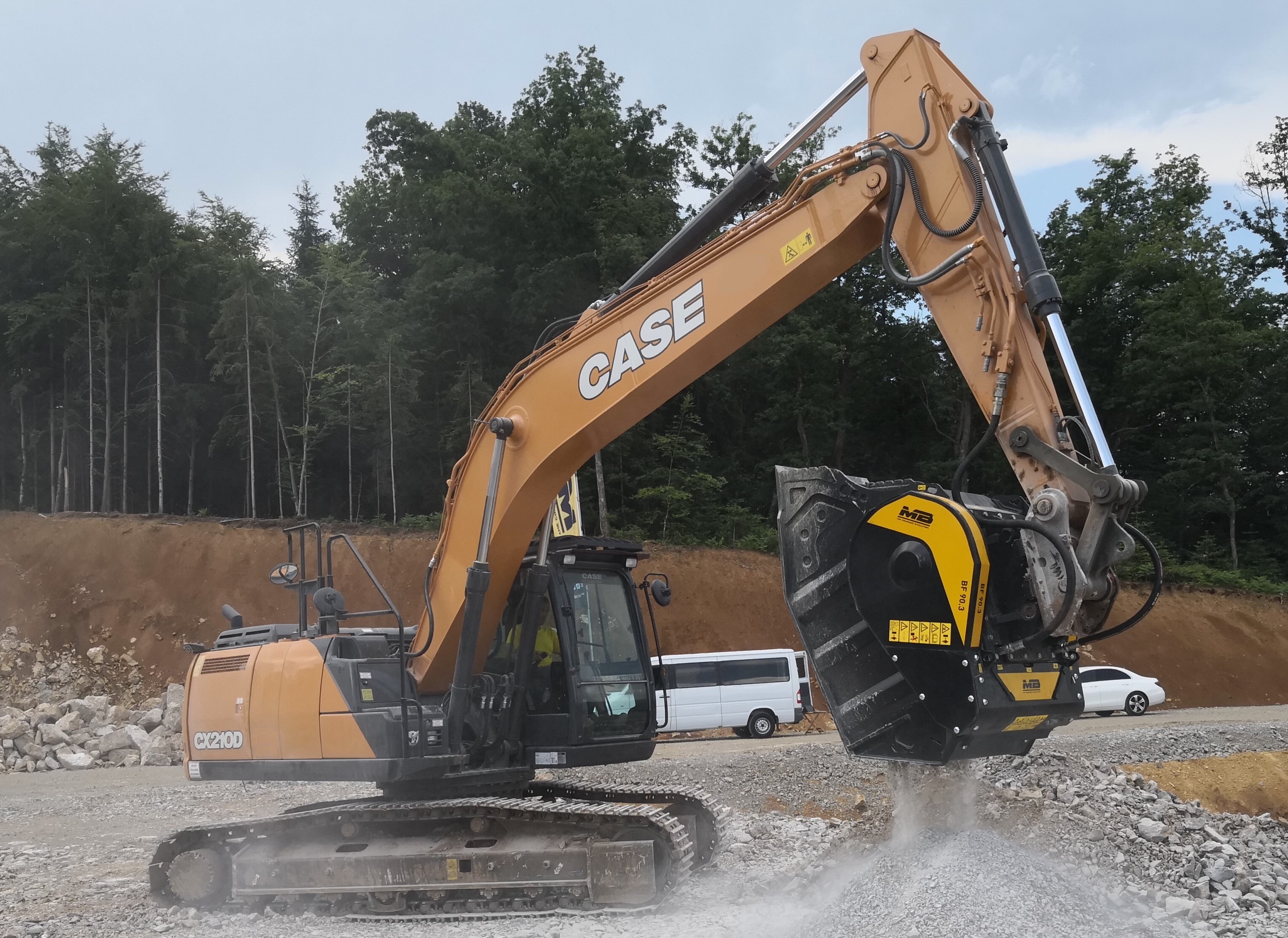 Mb Crusher | MB-BF90.3 S4 benna frantoio su Case CX210D, lavori di spianamento in cantiere.