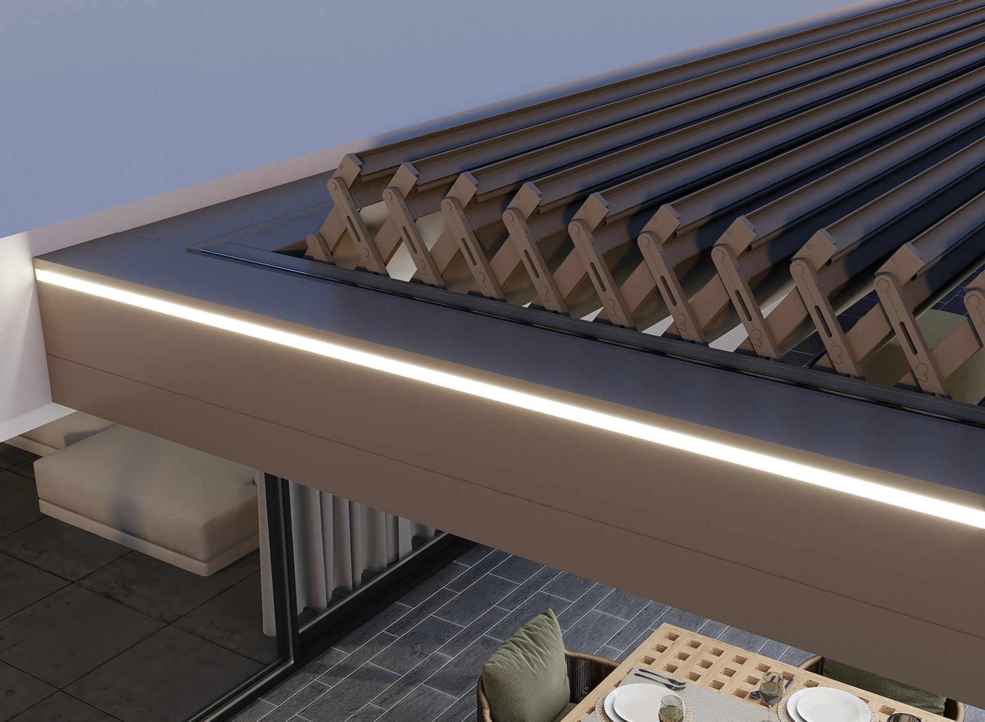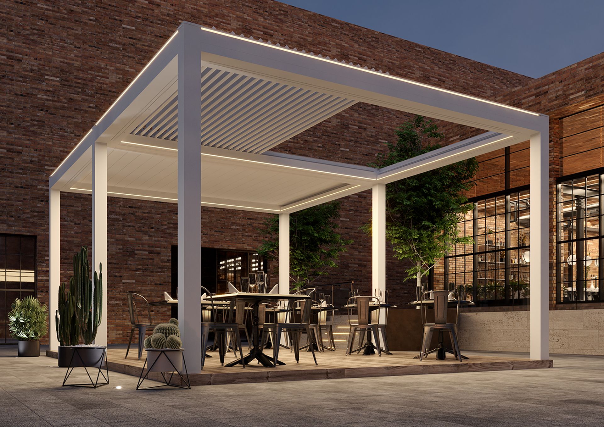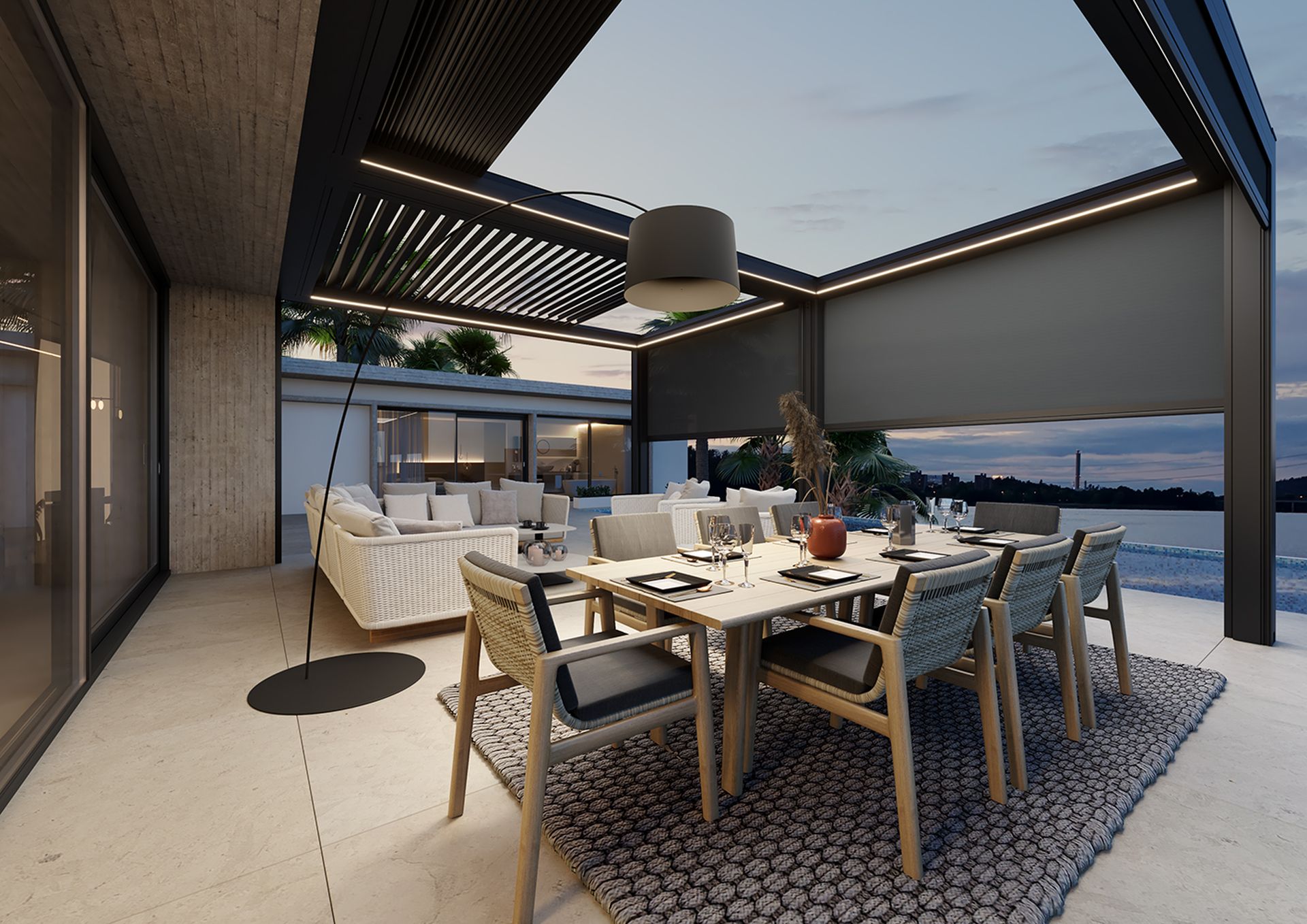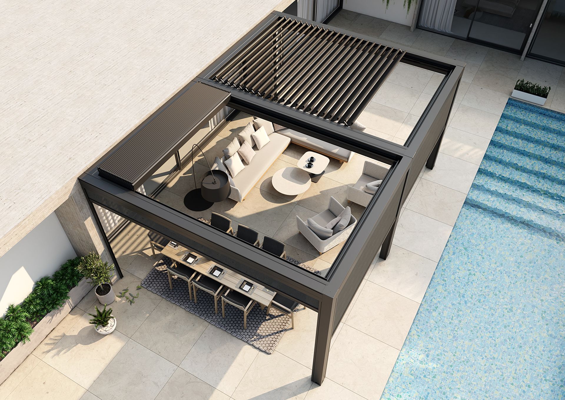 Adatta per essere installata sia in contesti residenziali sia commerciali, è stata progettata per avere importanti prestazioni di schermatura solare, tenuta al vento e riparo in caso di pioggia grazie a un sistema di deflusso dell’acqua integrato.