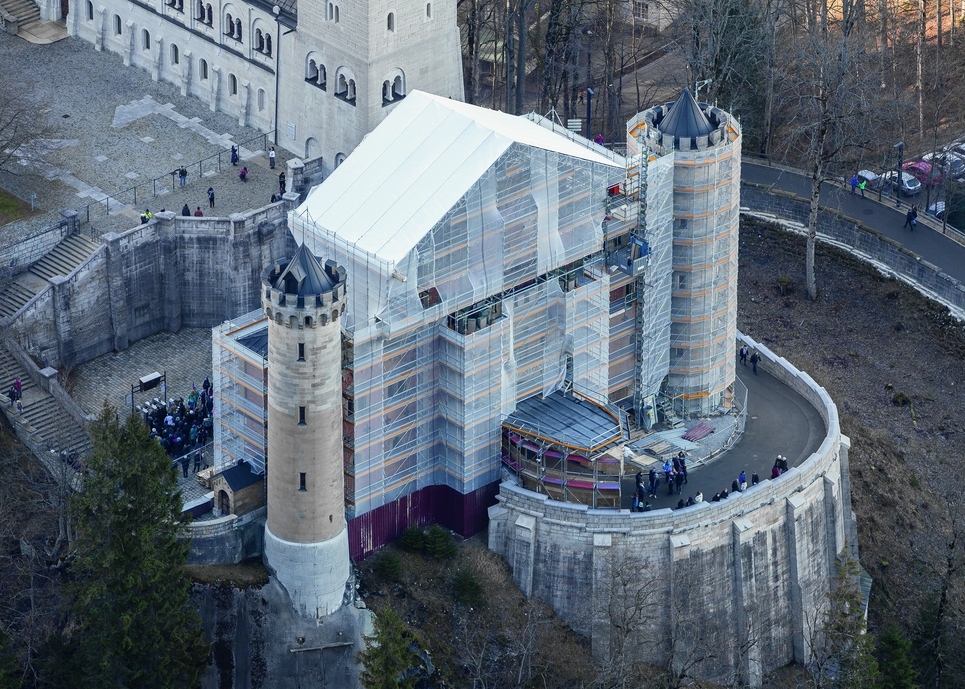 Gli enormi costi di manutenzione del castello di Neuschwanstein competono all’Amministrazione Bavarese dei Castelli. I movimenti della zona di fondazione vengono monitorati di continuo e periodicamente vanno messe in sicurezza le ripide pareti rocciose. Durante i mesi invernali, il clima rigido intacca le facciate di calcare e, in particolare, impone continui interventi di manutenzione del tetto. Questo è il motivo per cui il portale d’ingresso è ora completamente avvolto dalle impalcature. Una struttura di protezione temporanea copre la parte più antica del Castello che costituisce anche l’accesso al cortile interno. Durante i mesi invernali verranno individuati e documentati i danni alla facciata e al tetto, mentre i lavori di restauro vero e proprio inizieranno nella primavera 2017.