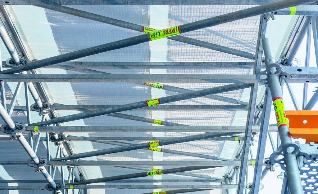 L’intero montaggio delle impalcature è stato effettuato senza impiegare sollevatori telescopici né gru. In particolare, per la realizzazione della copertura, i progettisti Peri hanno pianificato i lavori in modo che tutte le fasi di montaggio potessero essere eseguite manualmente.
