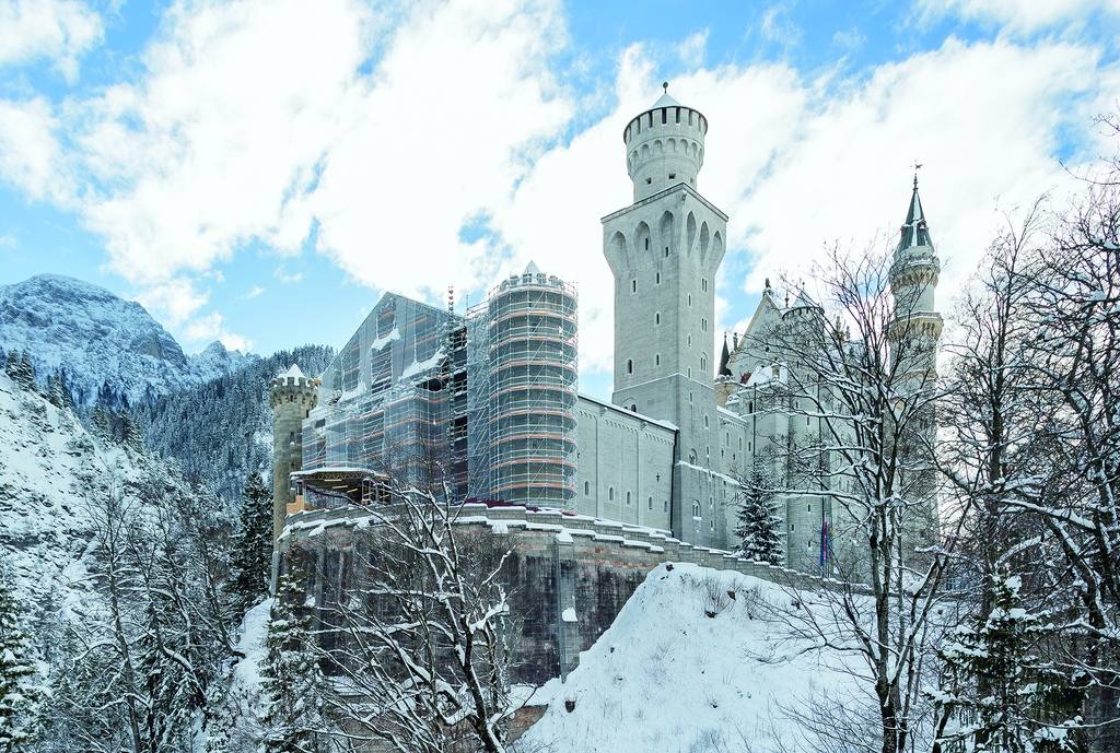 Per il restauro del portale d’ingresso del castello di Neuschwanstein,  impalcature di servizio e paramenti di protezione sono stati realizzati con il sistema modulare Peri Up Flex, che si è adattato in modo ottimale alle condizioni strutturali e ai requisiti statici del particolare edificio. L’uso esclusivo di componenti del sistema ha accelerato il lavoro di montaggio e, allo stesso tempo, ha aumentato i livelli di sicurezza. Per la prima volta, sono stati impiegati teli di copertura riscaldabili per impedire la formazione di carichi di neve durante i mesi invernali.