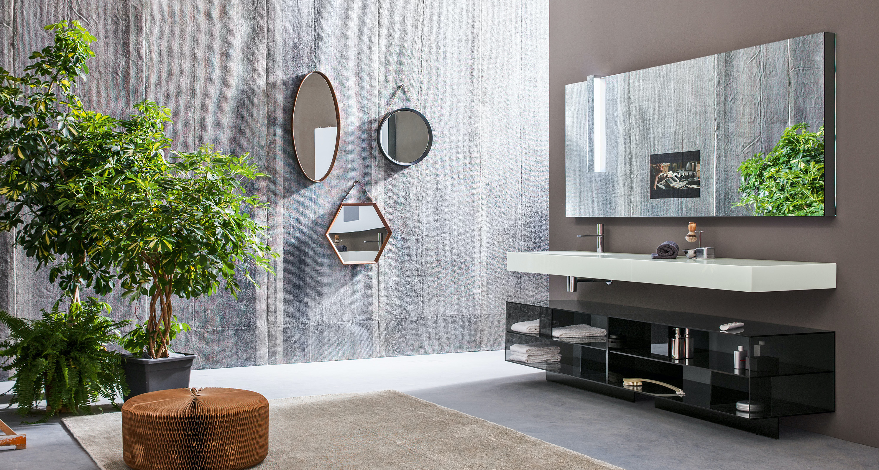 Il piano dei banconi Regolo può essere realizzato in cristallo lucido o silk oppure in opalite bianco o nero, con lavabo termofuso integrato o con foro per lavabo in appoggio o semincasso, e con doppio lavabo.