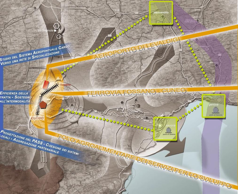 Linea ferroviaria cuneese. Il Pts/1 aveva già posto in evidenza la necessità del completamento della linea ferroviaria Fossano – Cuneo, fondamentale per sostenere il modello di sistema logistico diffuso e dedicato al settore agroalimentare. Il potenziamento e l’ammodernamento della linea ferroviaria che collega Cuneo a Torino da una parte e a Nizza dall’altra è stato infatti identificato come intervento prioritario.